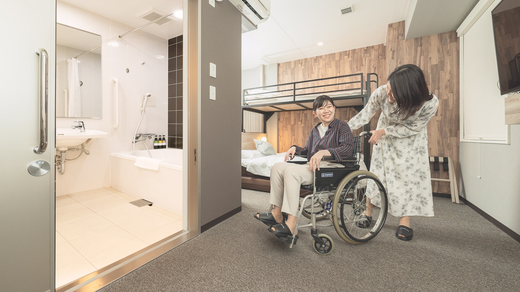 広めのお部屋で様々なお客様にお使い頂ける【ファミリールーム】です。150cm幅ダブルベッド、90cm幅ロフトベッドをご用意しております。