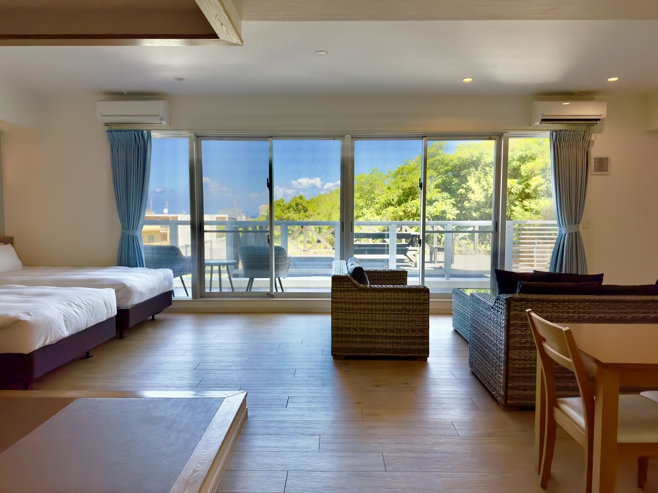 広々50畳(89平米)の客室に15畳(25平米)のウッドデッキテラス付 キッチン付きコンドミニアム タイガービーチまで徒歩2分!