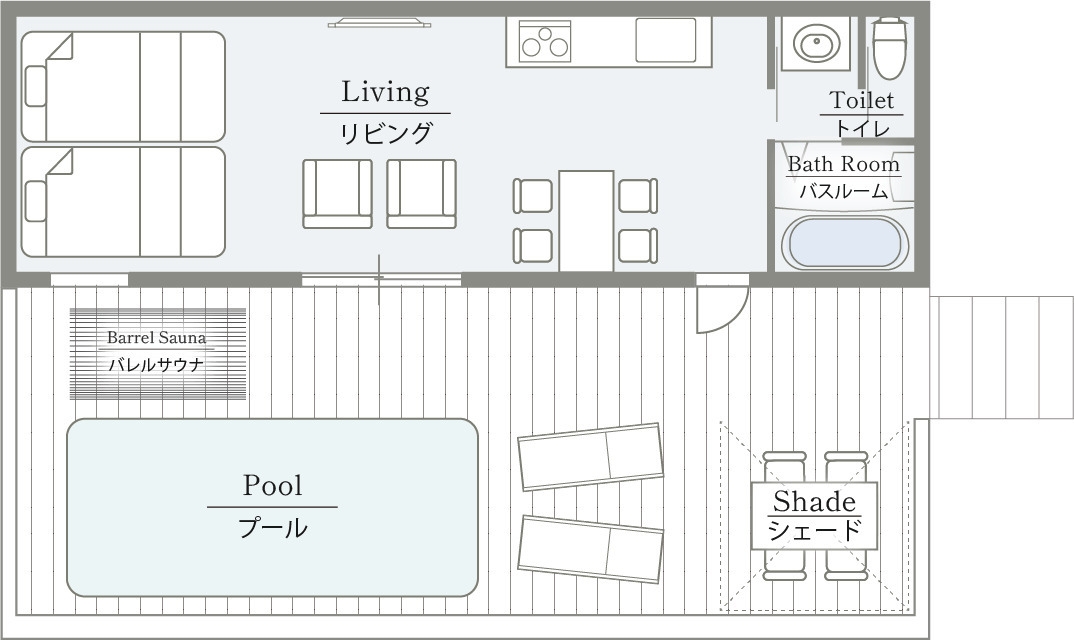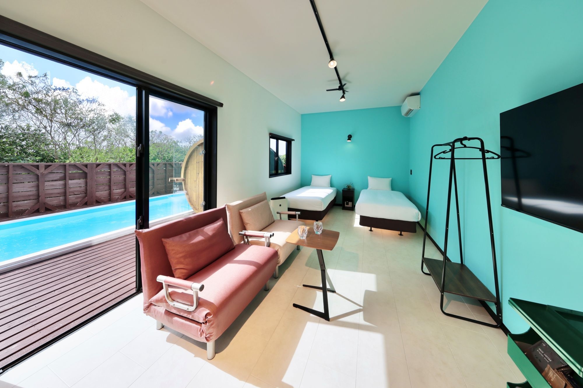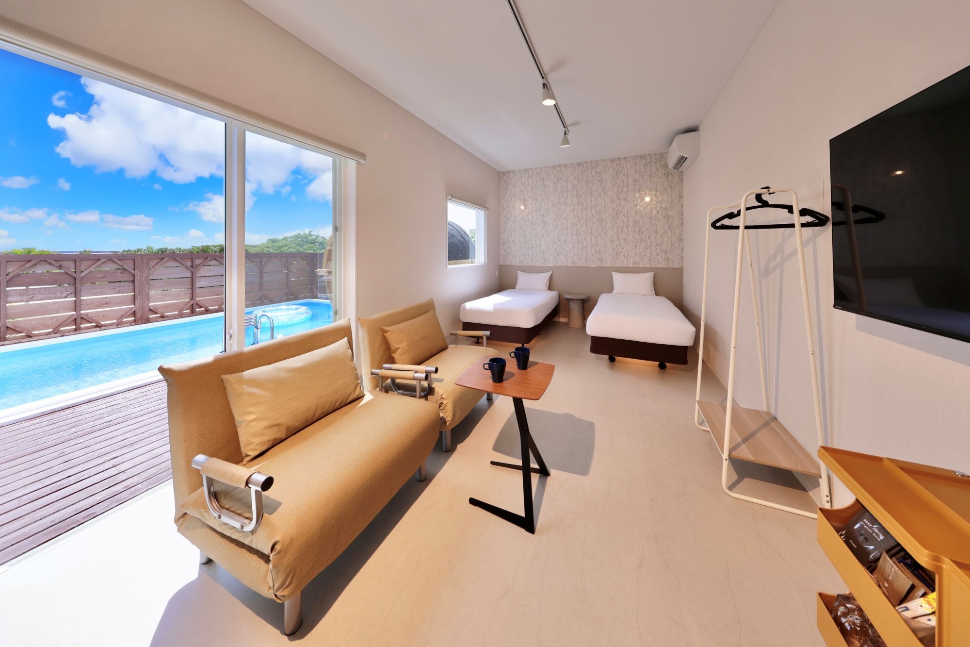 シングルベッド×2台、ソファーベッド×2台 ※お部屋が狭いため、2名様でのご利用をおすすめしております。 ※プールは温水ではございません