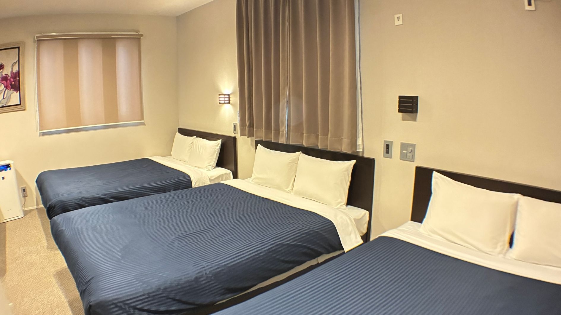 【デラックストリプルルーム】ダブルベッド3台 6名様までご宿泊可能です。洗濯機・キッチン(調理器具付き)を設置しているので長期のご宿泊もより最適です。