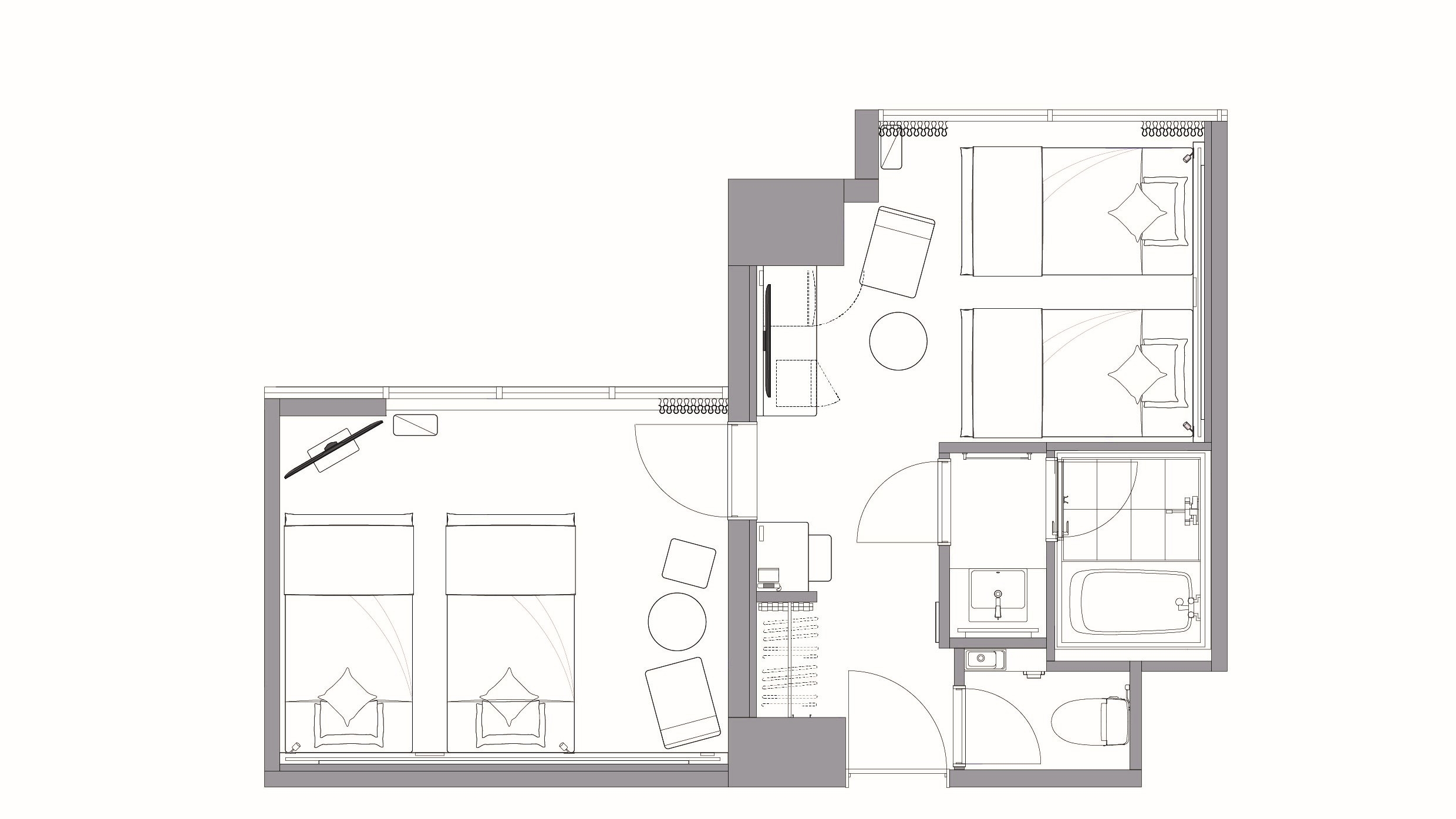 【2025年リニューアル!】 ベッド幅:110cm×4台/エキストラベッド100cm×1台 広さ:37.1平米 ■バス・トイレ・洗面台別■