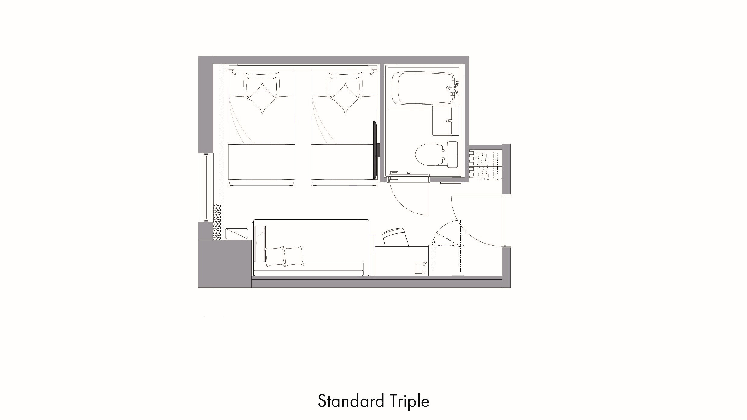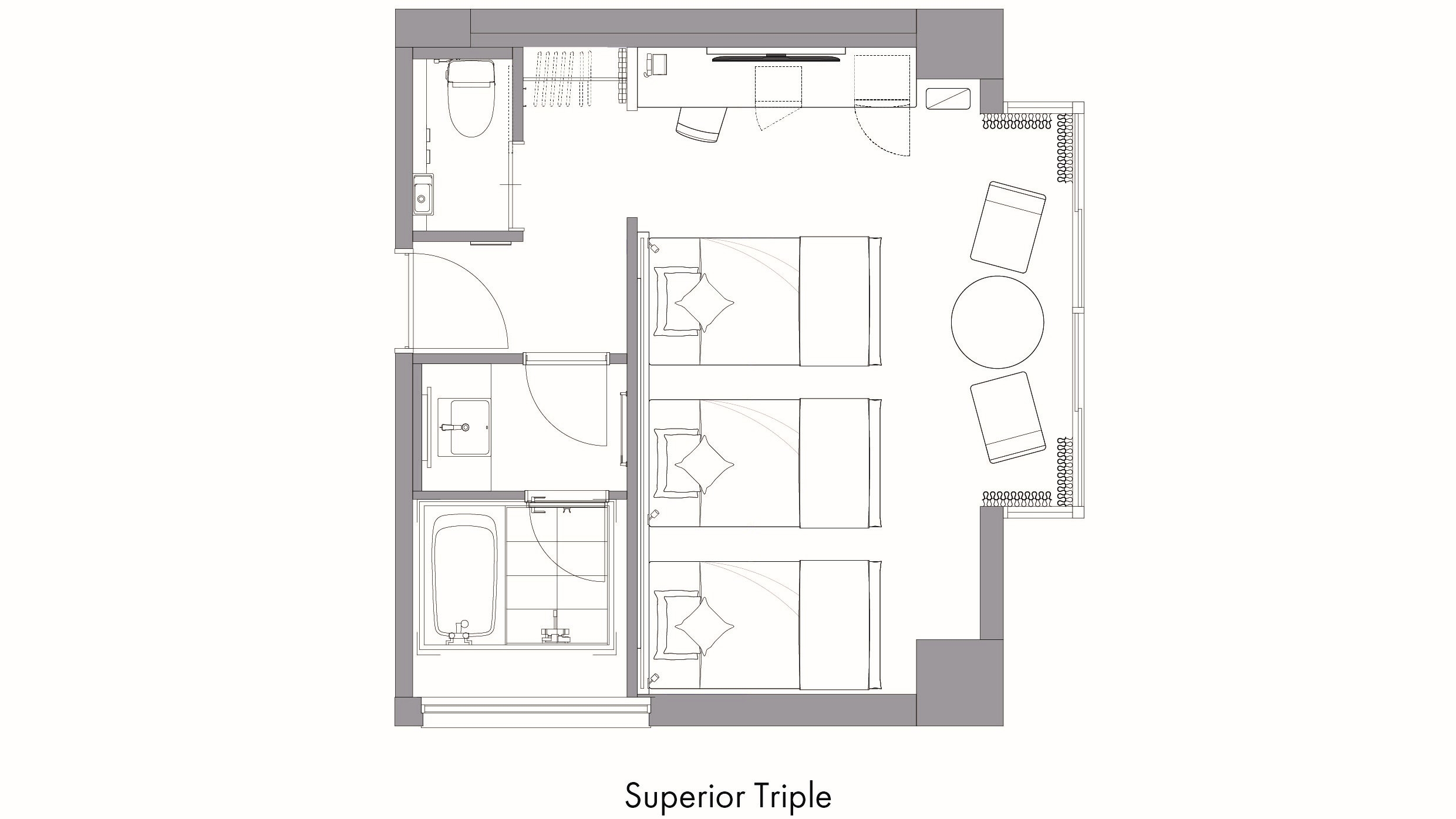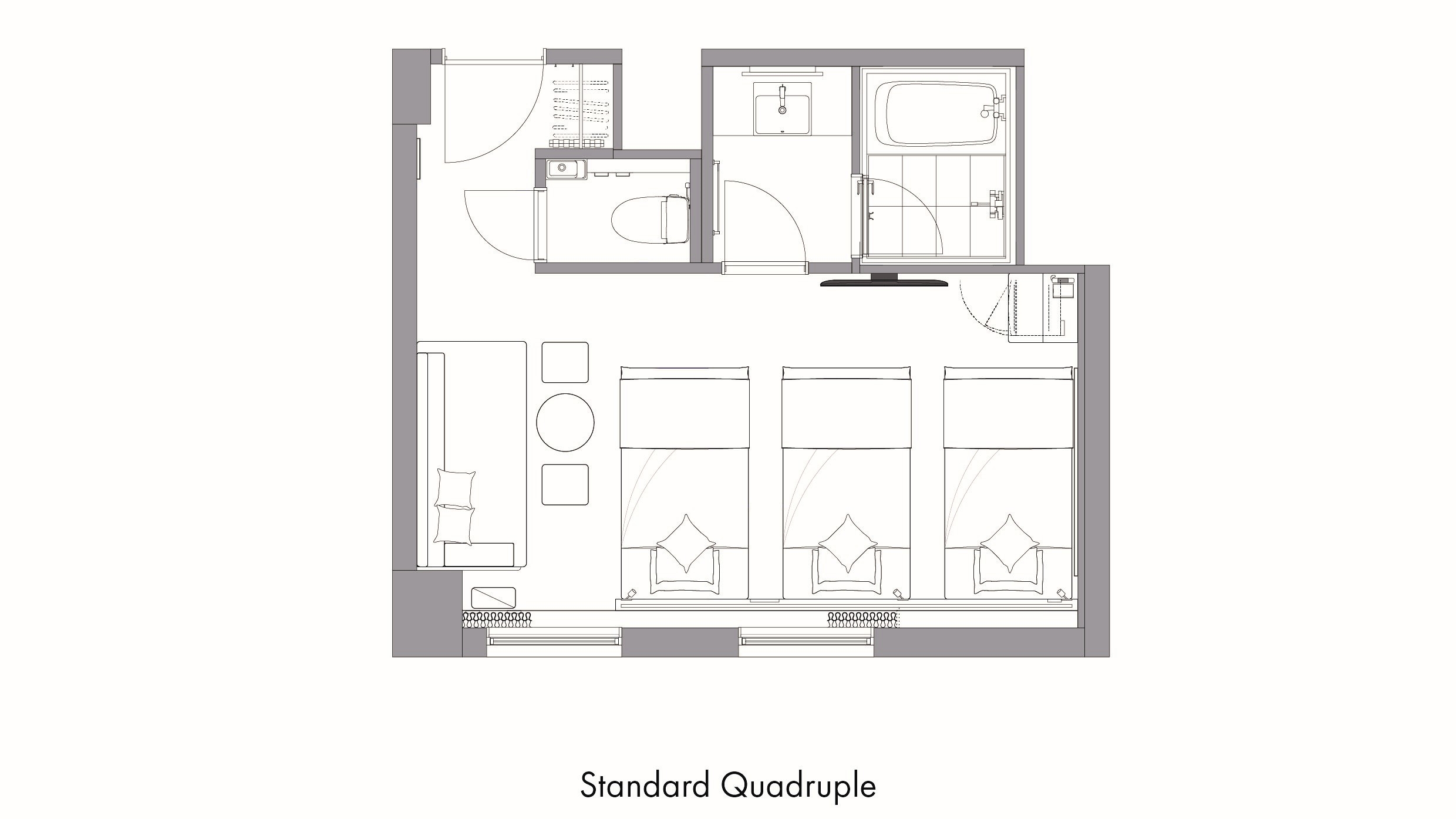 【2025年リニューアル!】 ベッド幅:110cm×3台、エキストラベッド95cm×1台 広さ:31.3平米 ■バス・トイレ・洗面台別■