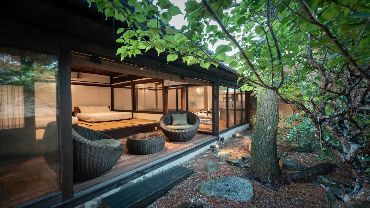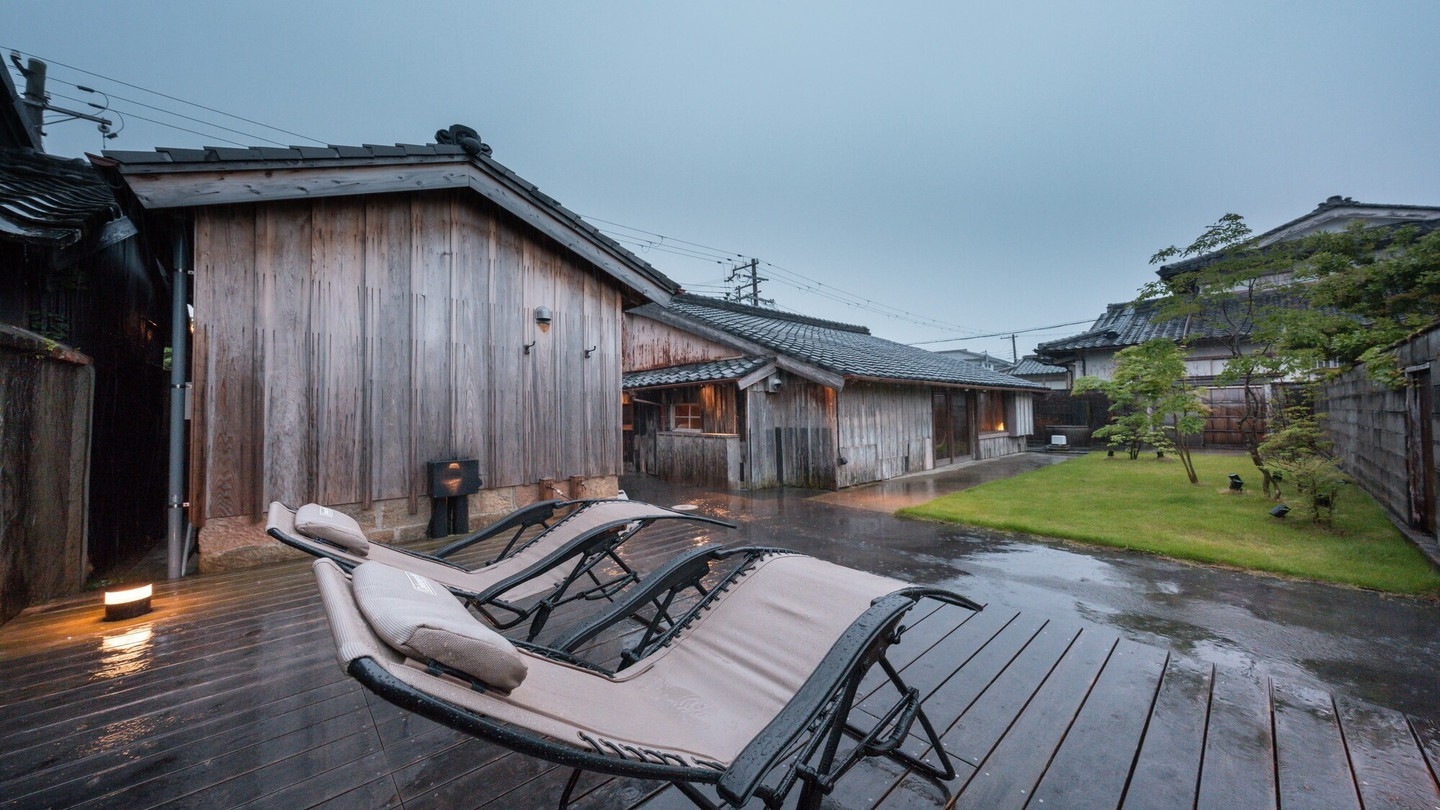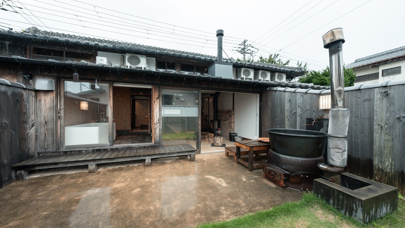 鉄製の五右衛門風呂(ガス給湯タイプ)、こじんまりながら専用の庭とデッキで外気浴。癒しの時間をお過ごしいただけます。広さ:60平米、布団:セミダブルマットレス2台