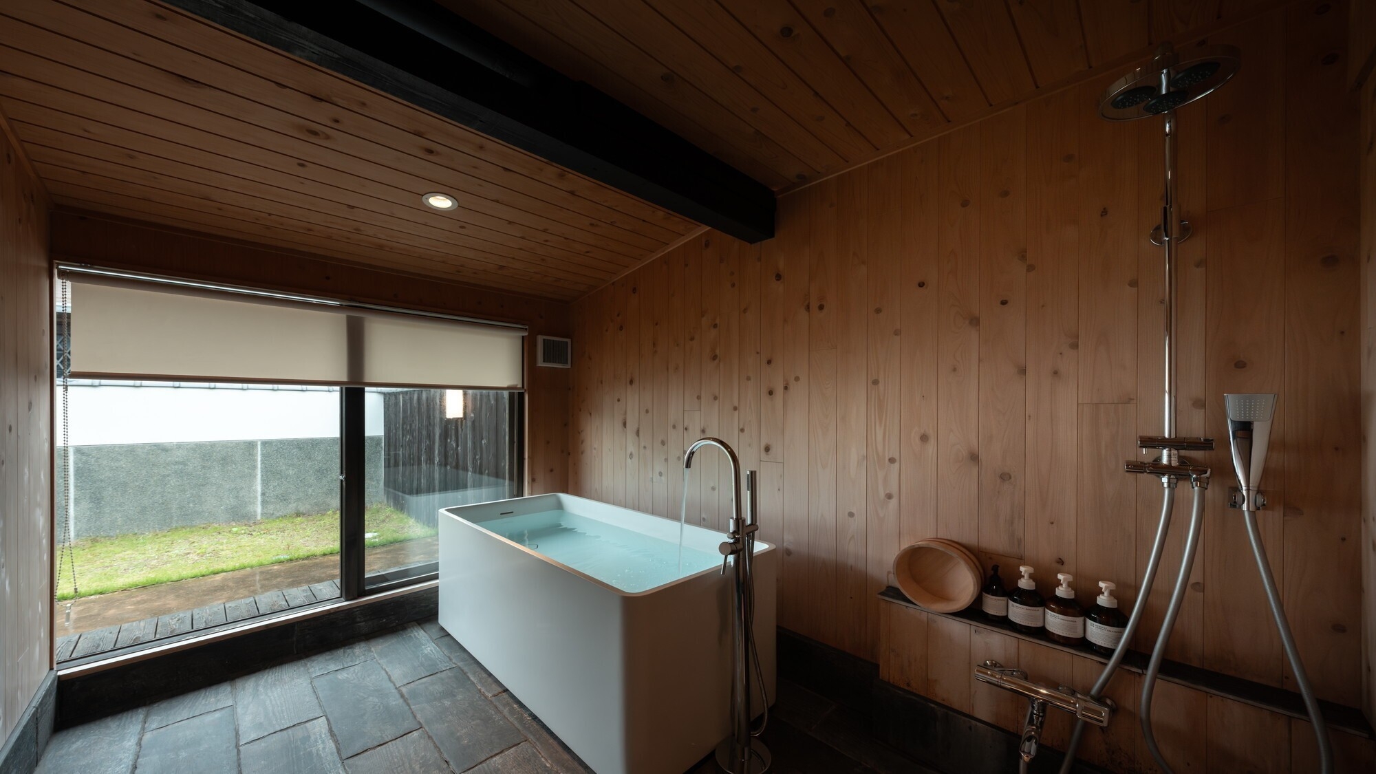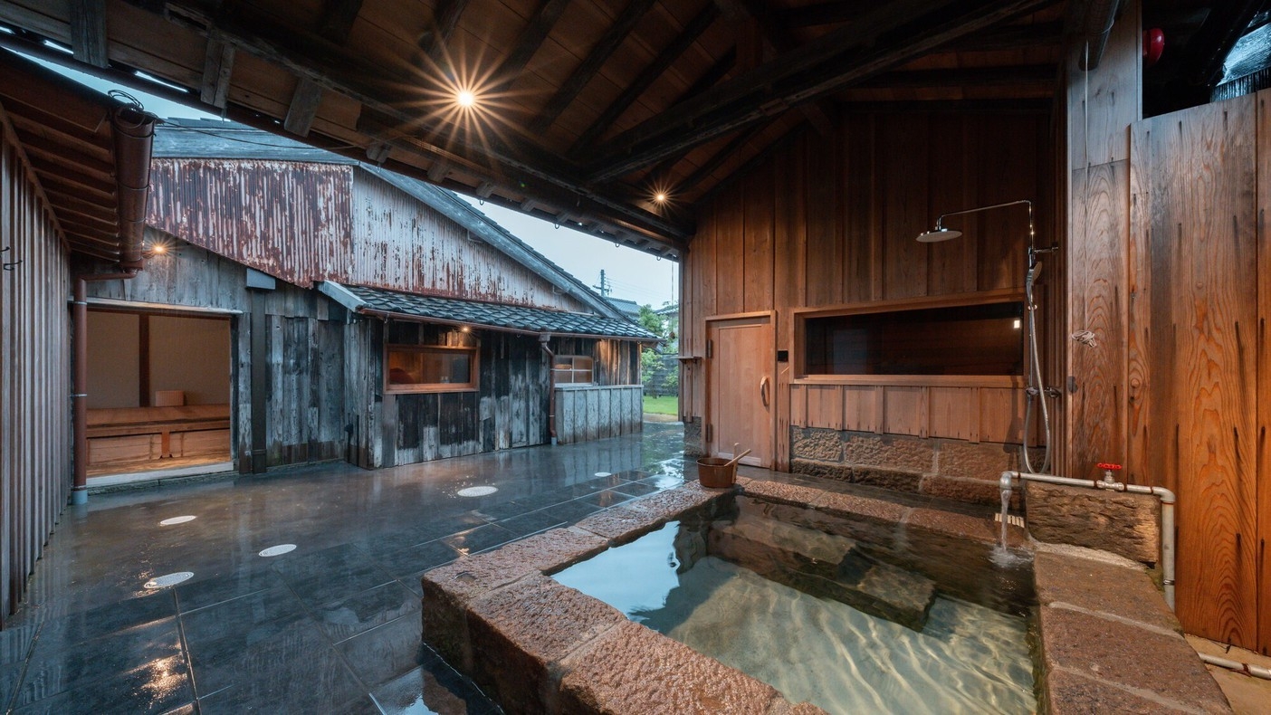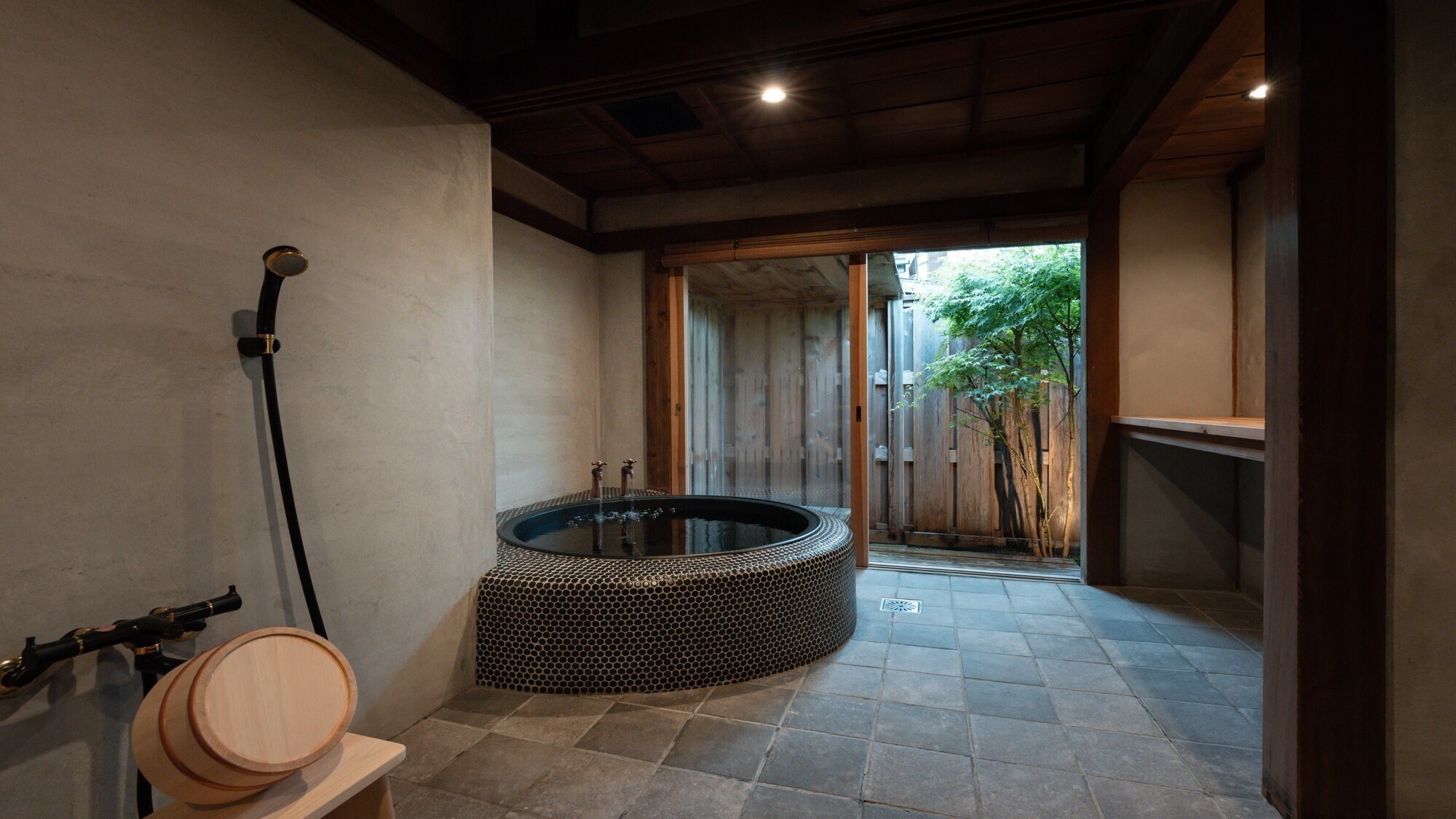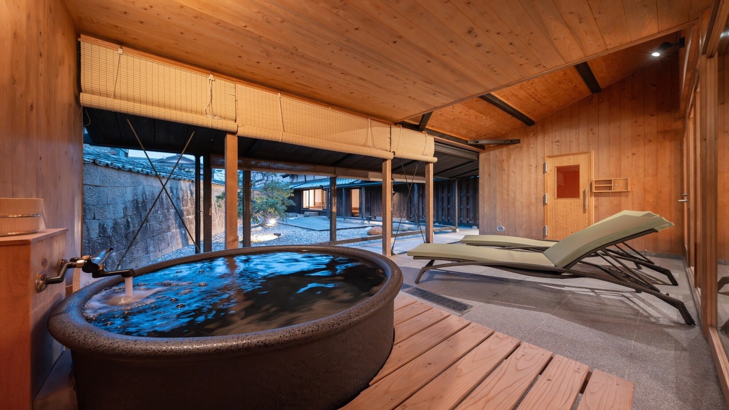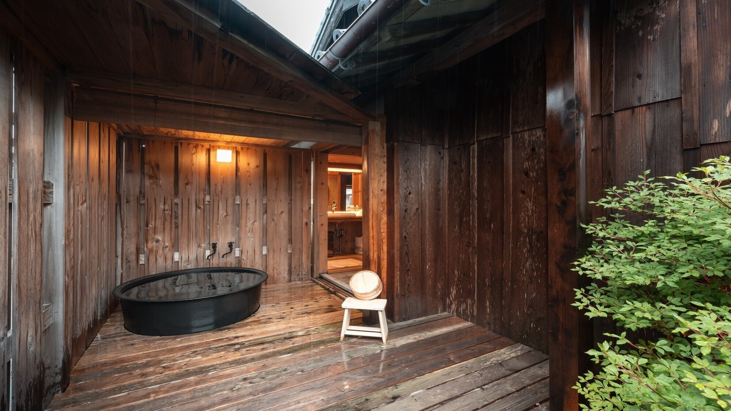 露天の五右衛門風呂(ガス給湯タイプ)でくつろぐ贅沢な時間をご堪能くださいませ。広さ:60平米、ベッド:セミダブルベッド2台