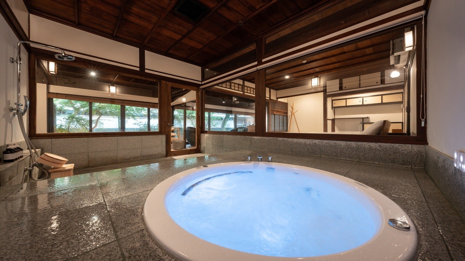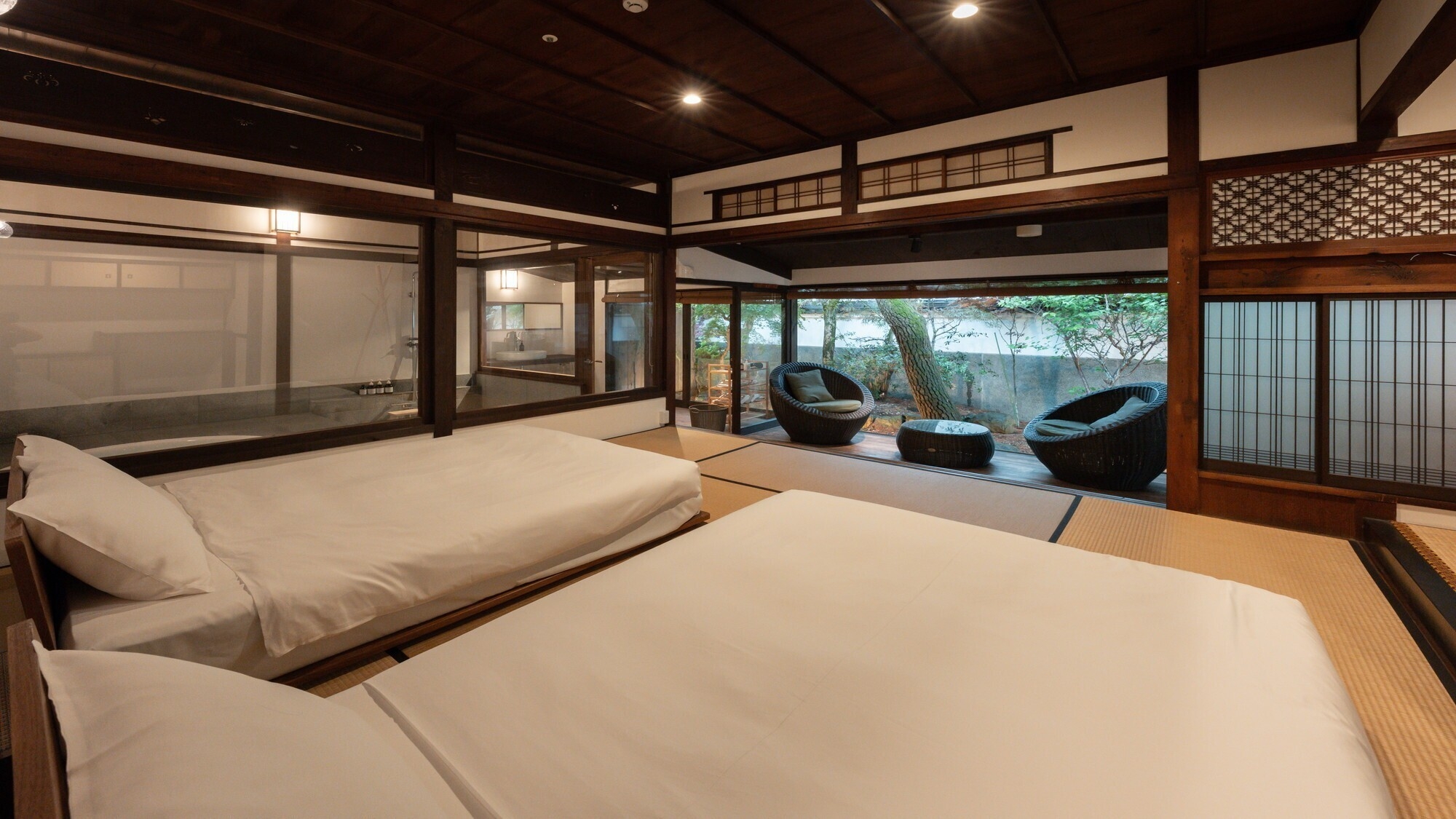 広々とした浴室とジャグジー風呂で非日常空間をお愉しみくださいませ。広さ:50平米、寝具:ダブルベッド2台、お布団(1名様まで追加可能)