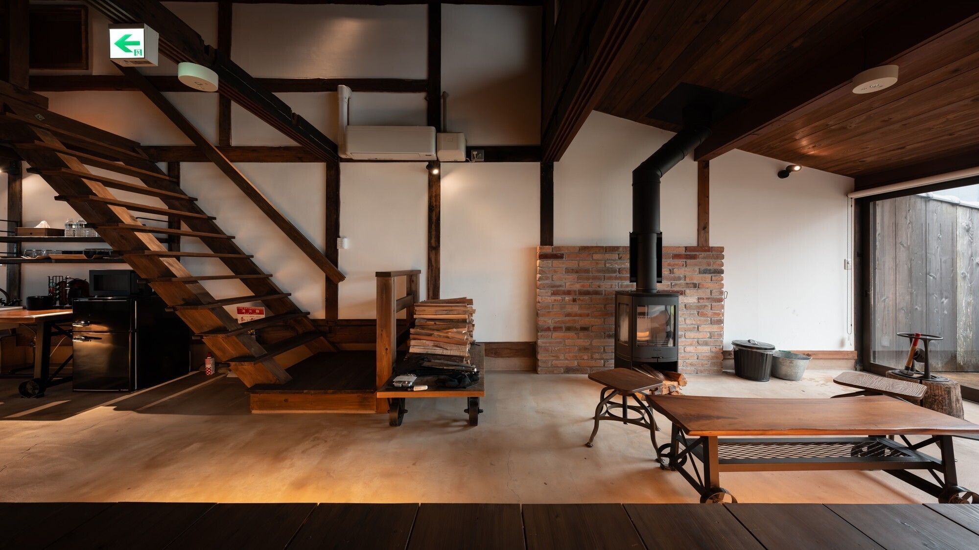 薪で沸かす五右衛門風呂と広々とした土間リビングに設置された薪ストーブ。心落ち着く時間をお過ごしくださいませ。広さ:80平米、寝具:お布団のみ
