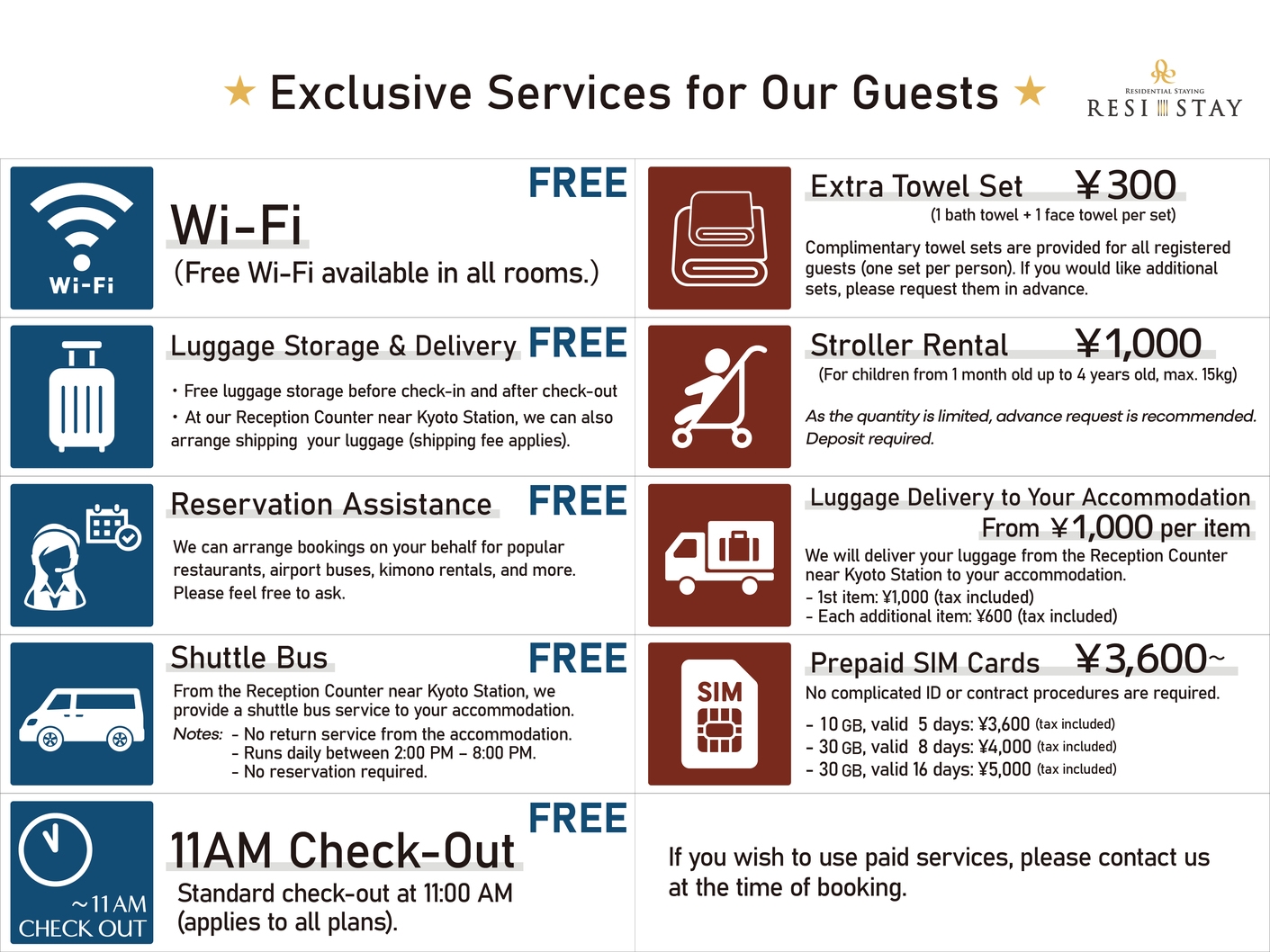 京都駅前のレセプションカウンターで行っております(午前8時〜午後8時)