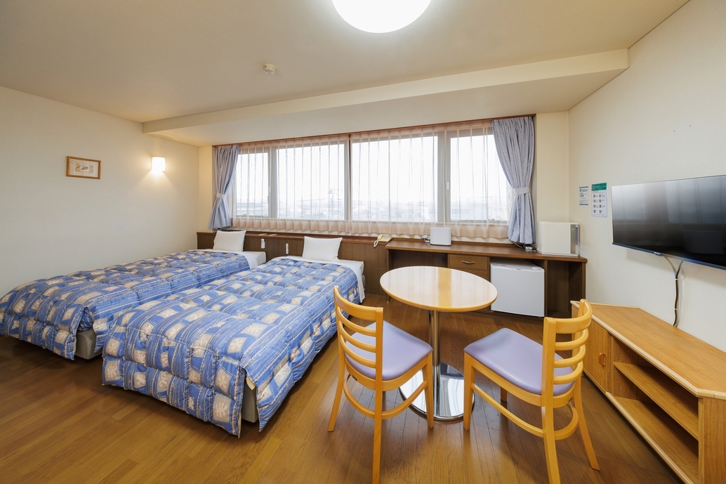 ワンルームマンションタイプのツインルーム。フローリングで部屋の広さは当館一。※大人1名利用の場合の添い寝は出来かねます。