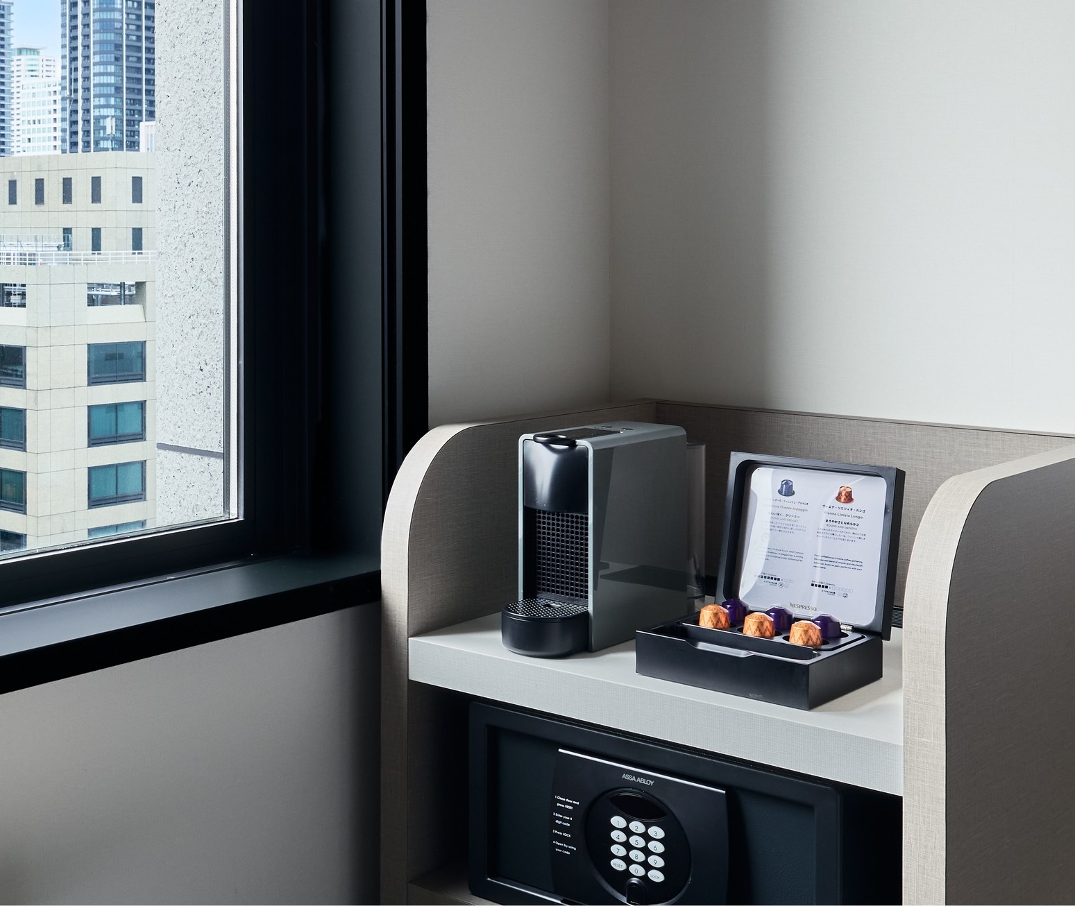 ネスプレッソ完備のプレミアムルーム。高層階からの明るい部屋でシティービューをお楽しみください。 20平米、ツインベッド(ベッド2台)の客室。 お一人様1杯のウェ
