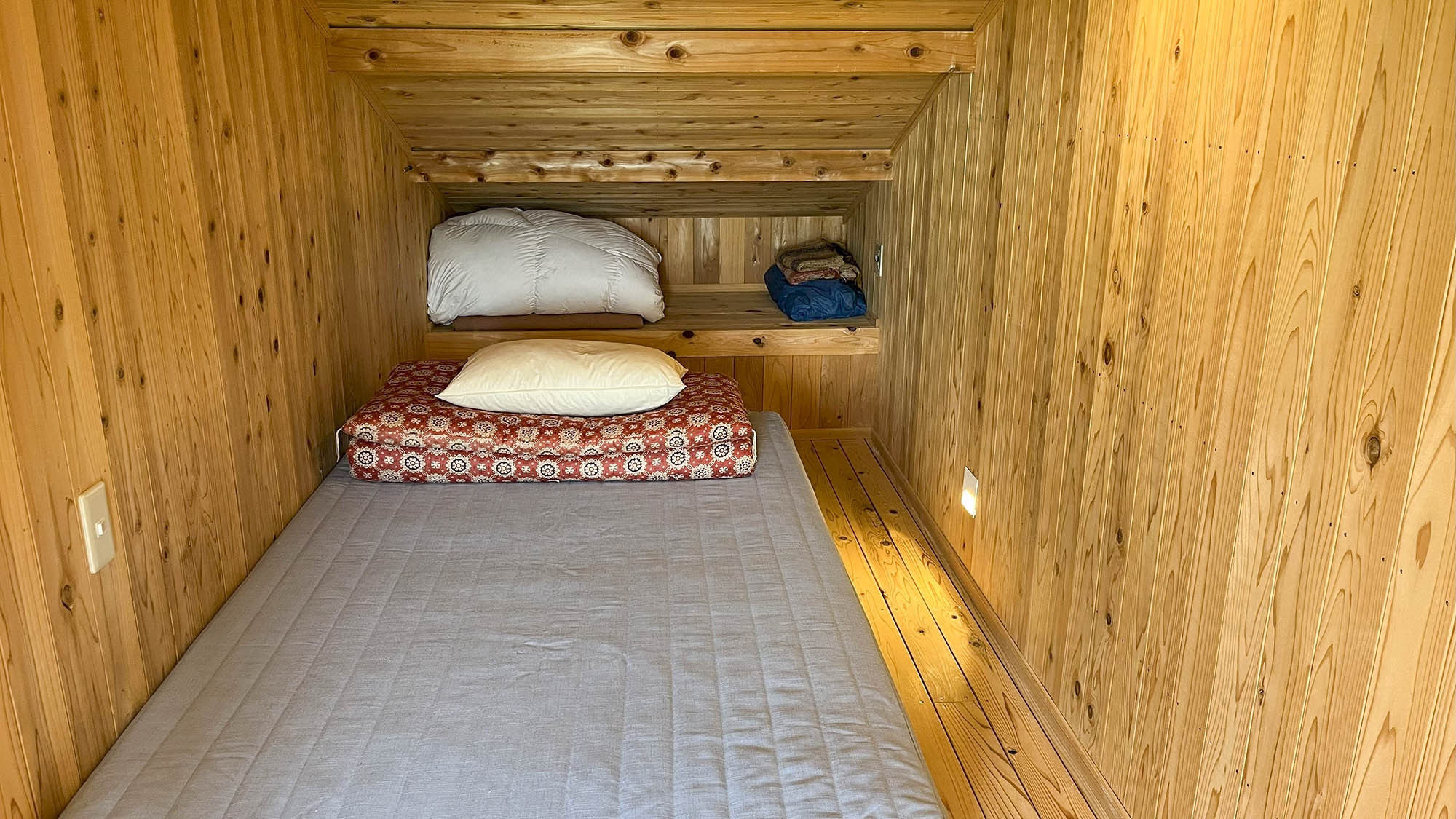 寝室3カ所(うち1室は仕切り付ベッドスペースの半個室)とリビング、キッチン、シャワー室を完備。※エアコンは設置していません(扇風機のみ)。冬は石油ストーブを使用