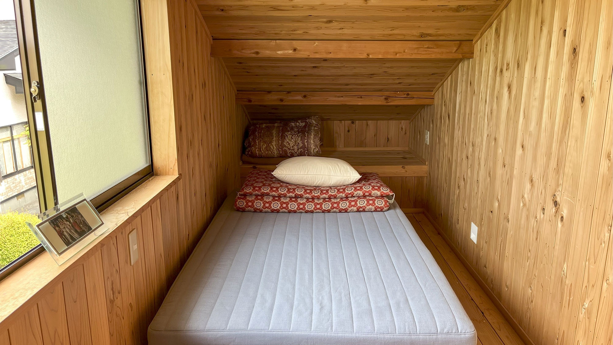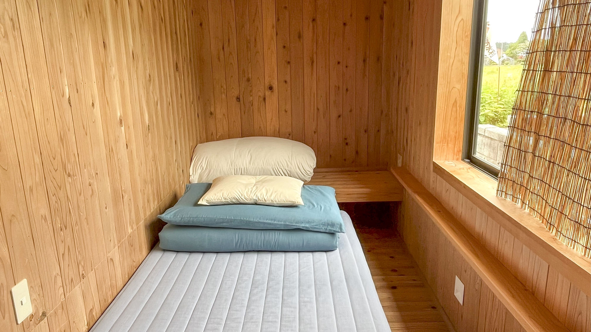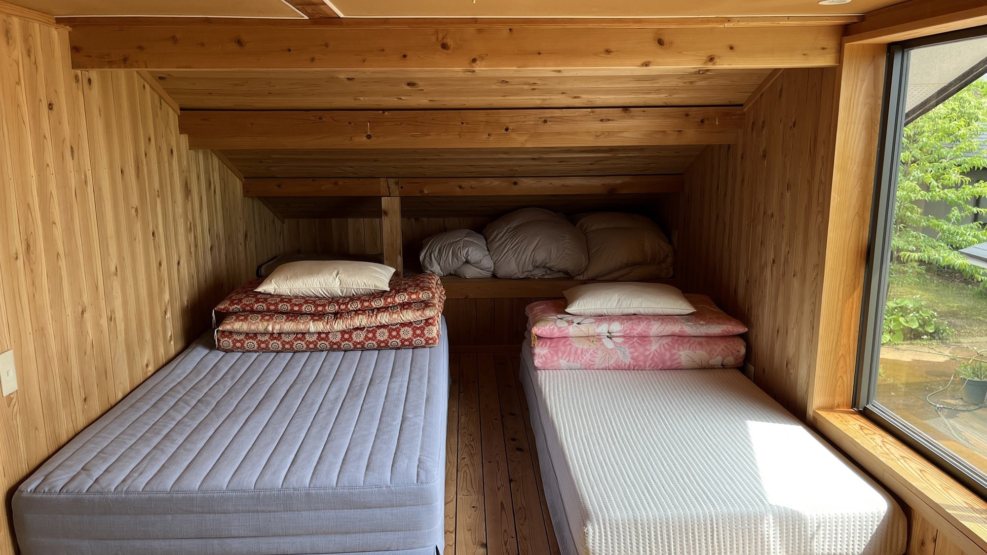 シングルサイズのマットレス2台を備えた個室。共用設備:リビング、キッチン、シャワー室。※エアコンは設置していません(扇風機のみ)。冬は石油ストーブを使用