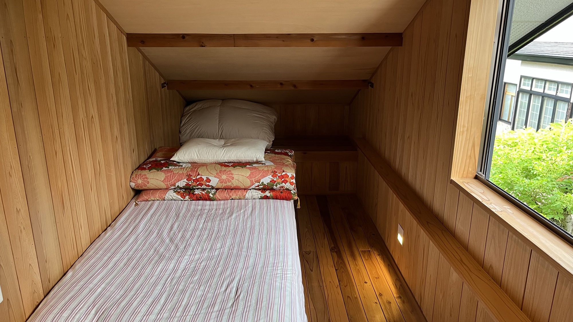 扉なし仕切り有の3名分のベッドスペースを備えた個室。共用設備:リビング、キッチン、シャワー室。※エアコンは設置していません(扇風機のみ)。冬は石油ストーブを使用