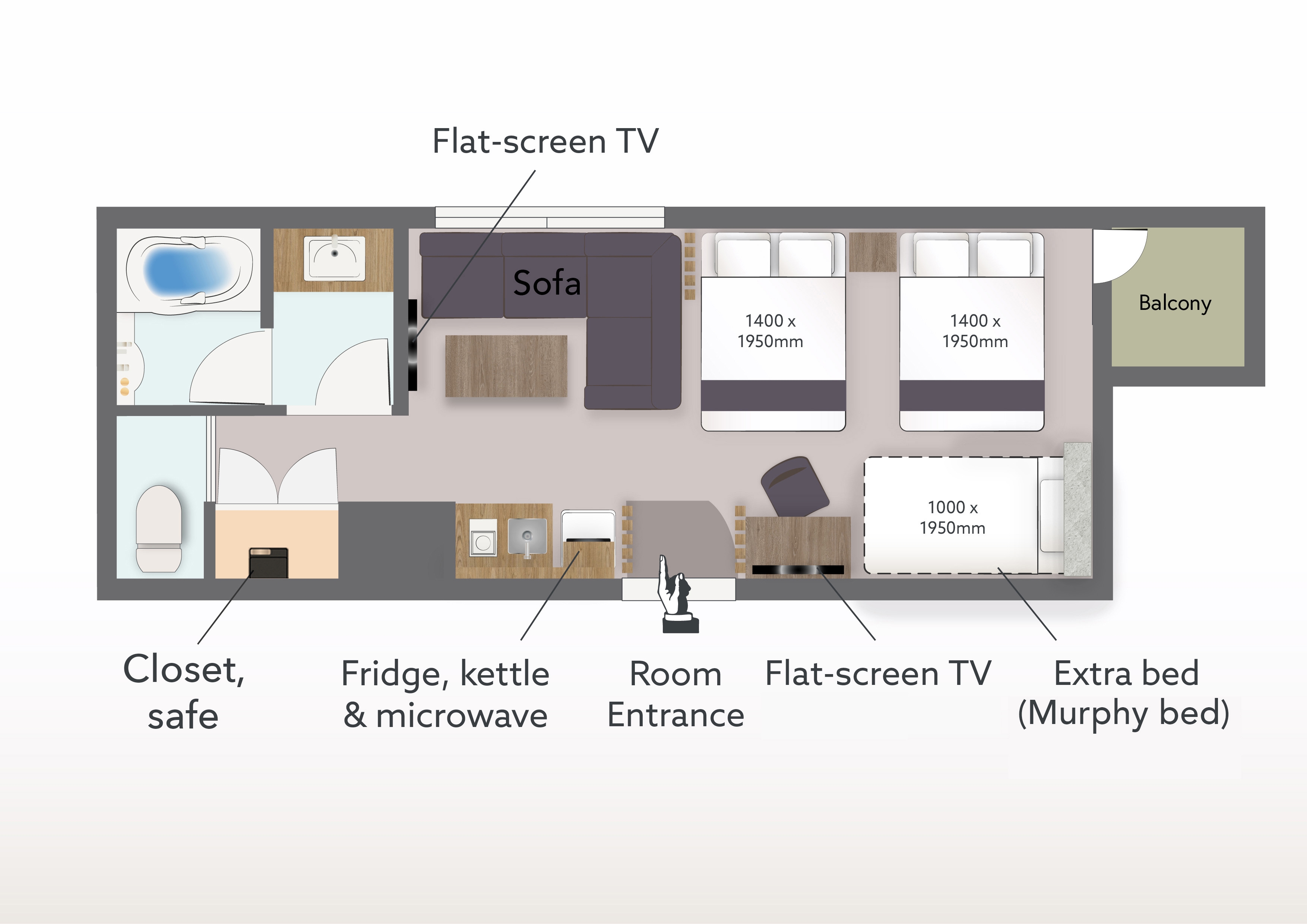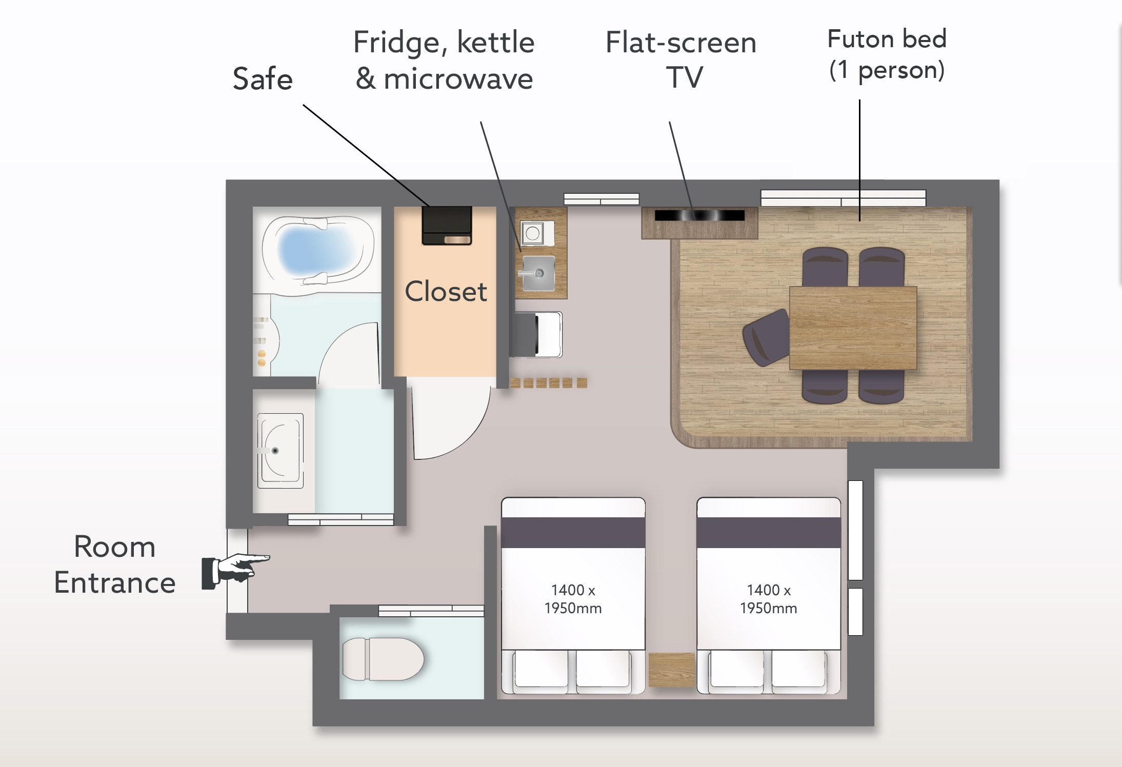 最大5名様まで宿泊可能なくつろぎの客室。ダブルベッド2台、壁収納式ベッド、広めのダイニングスペースと簡易キッチンを完備。