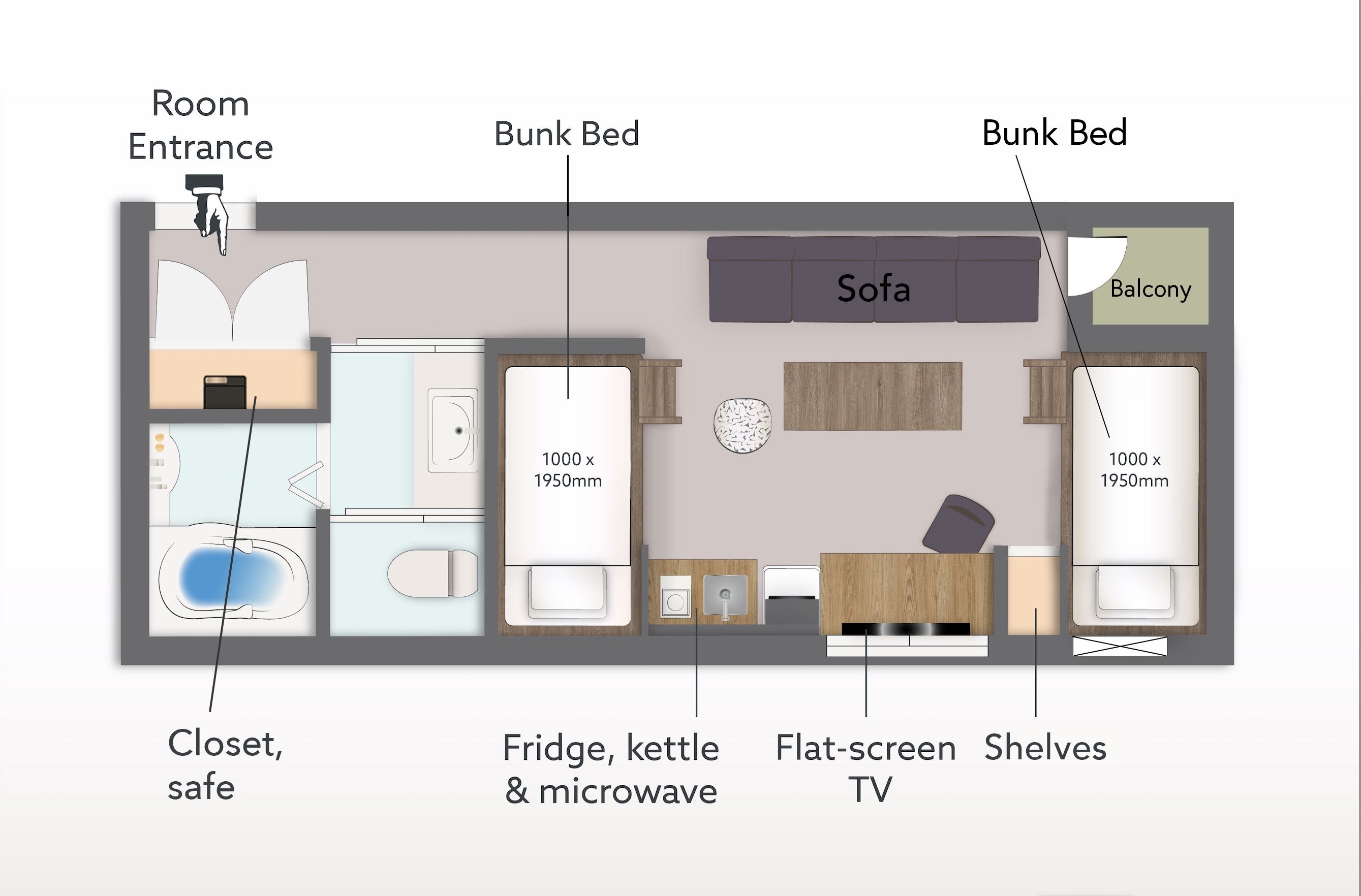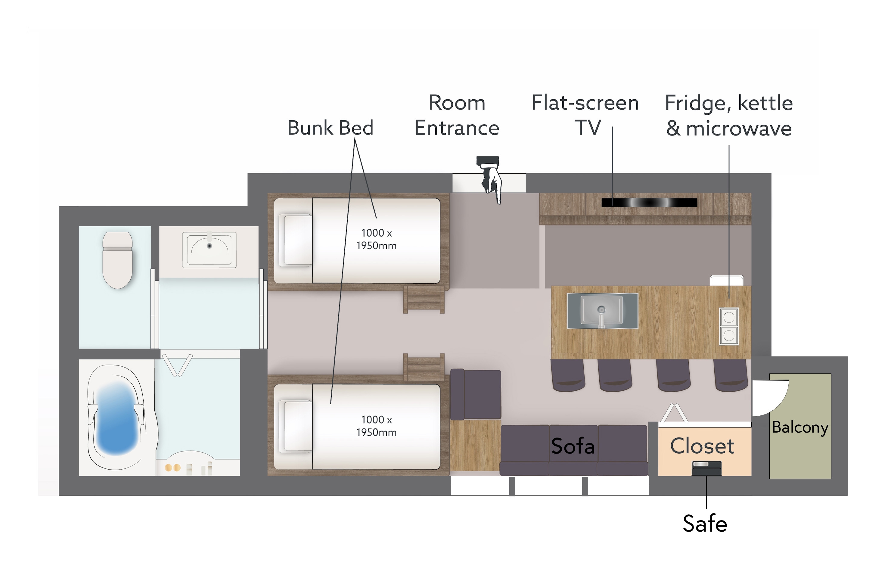 4名様までのグループ旅行に最適な、二段ベッド4台と簡易キッチン付きのお部屋。ソファでくつろぎながら旅の楽しい計画を。
