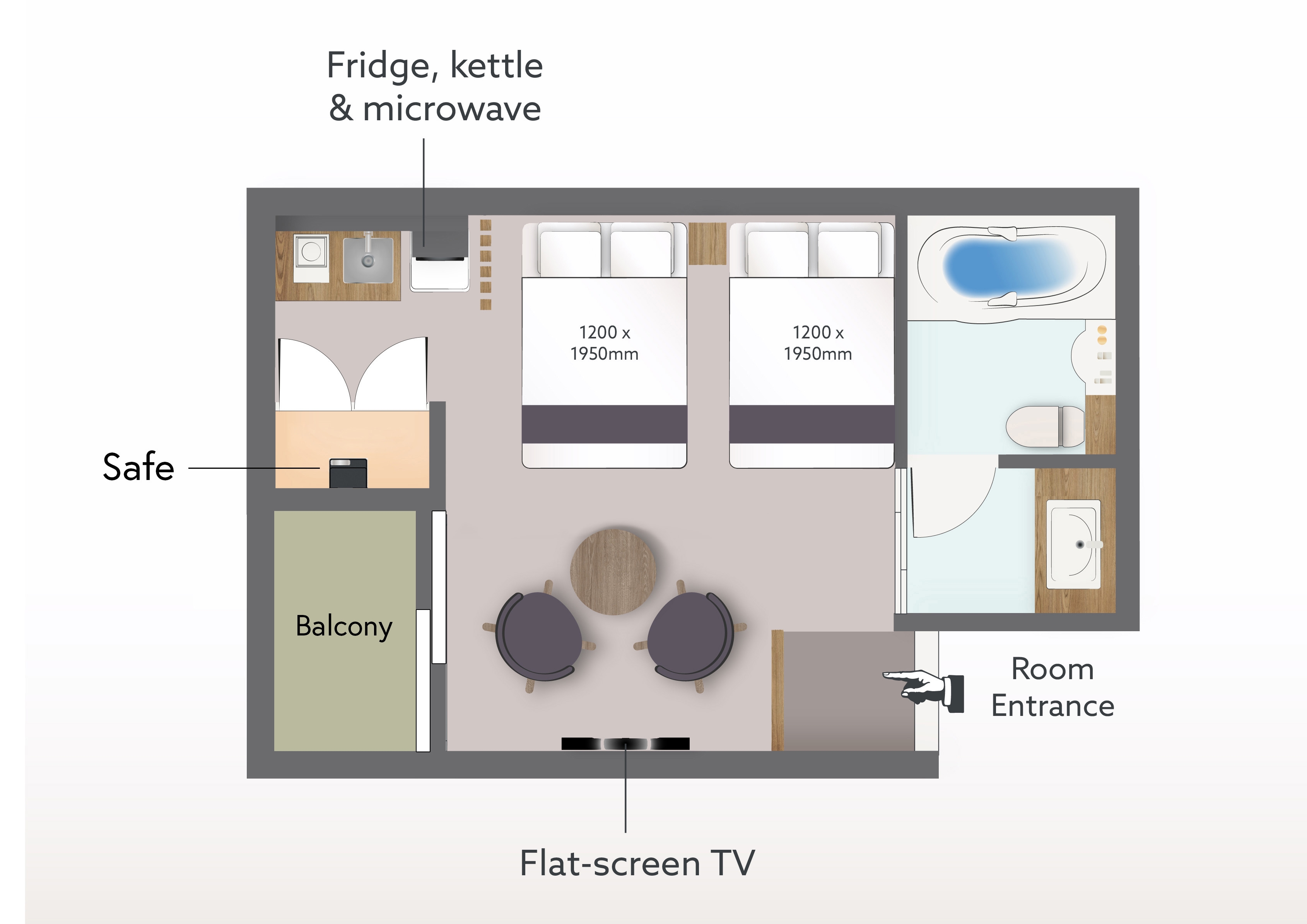 セミダブルベッド2台と、簡易キッチンを完備した2名様用のクラシックなツインルーム。少し贅沢なひとときをお楽しみください。