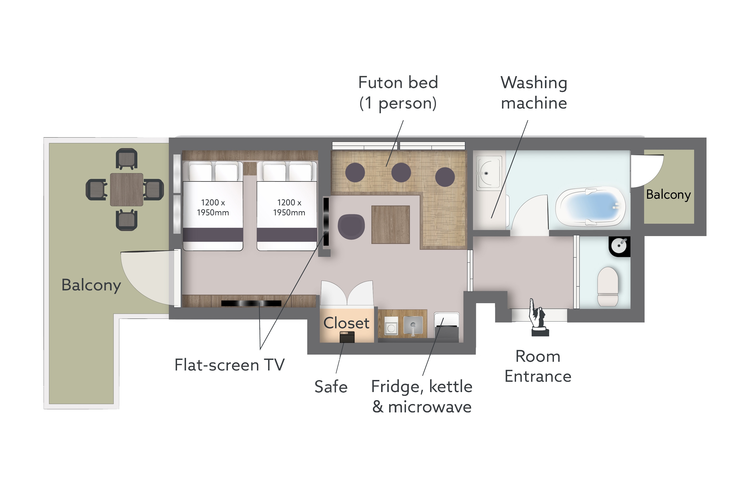 プライベートテラスの広々リラックス空間。セミダブルベッド2台と布団、簡易キッチン完備で最大3名様宿泊可能。