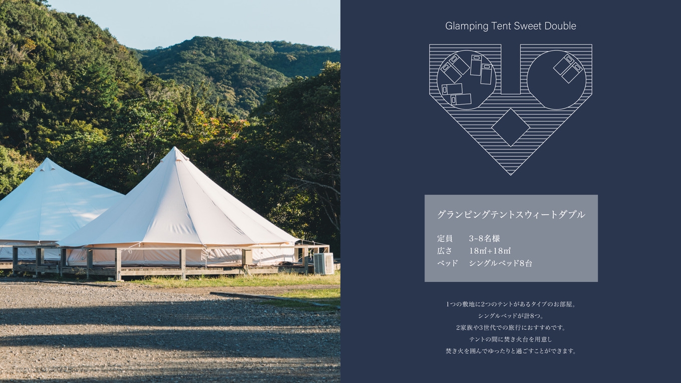 3人〜8人のグループに適したテントに泊まるグランピングです。