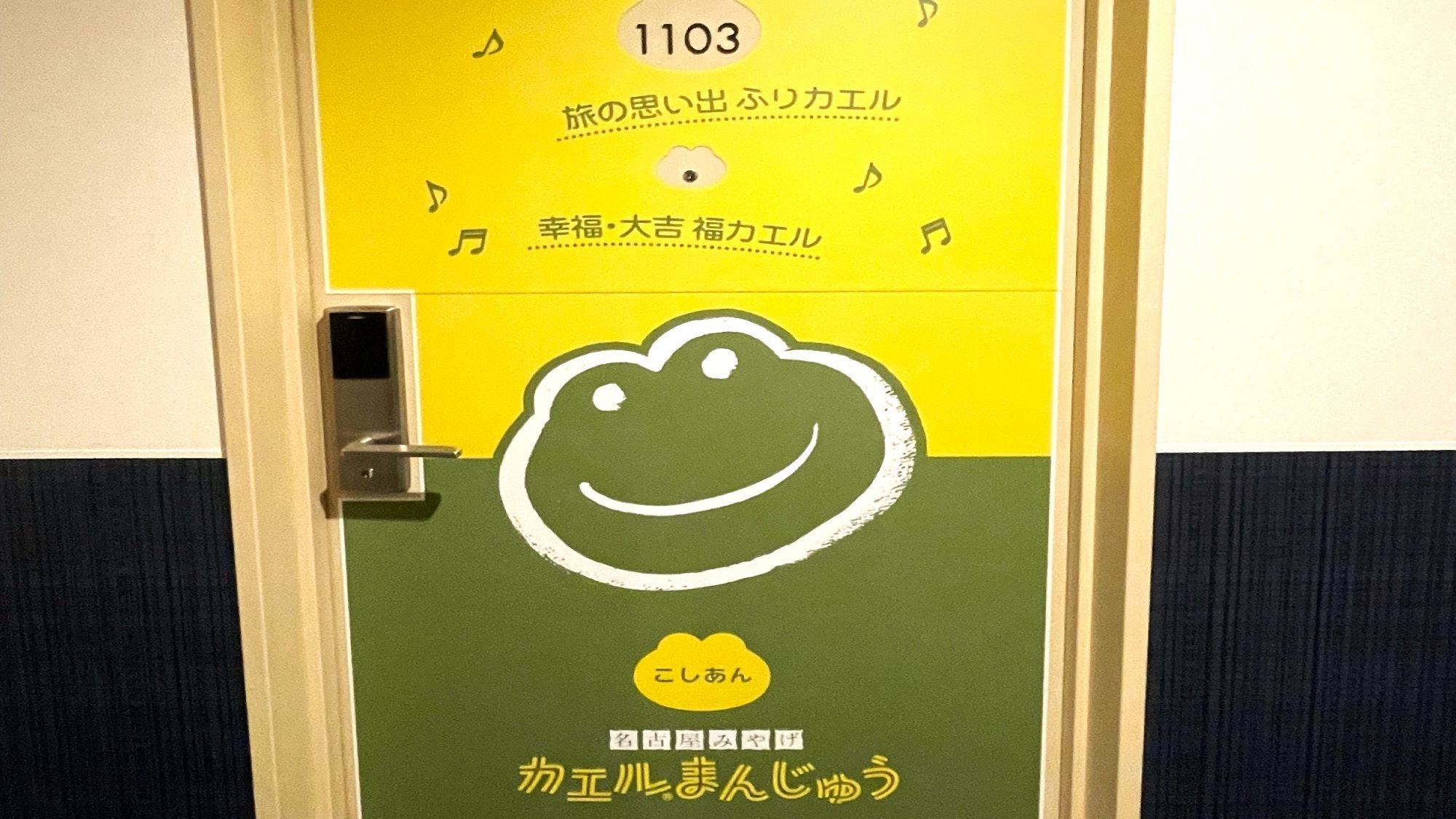 名古屋の老舗菓子店 青柳総本家の「カエルまんじゅう」とコラボレーションの特別なお部屋 /室内備品の持ち帰りはご遠慮ください /特典のぬいぐるみは別途お渡しします