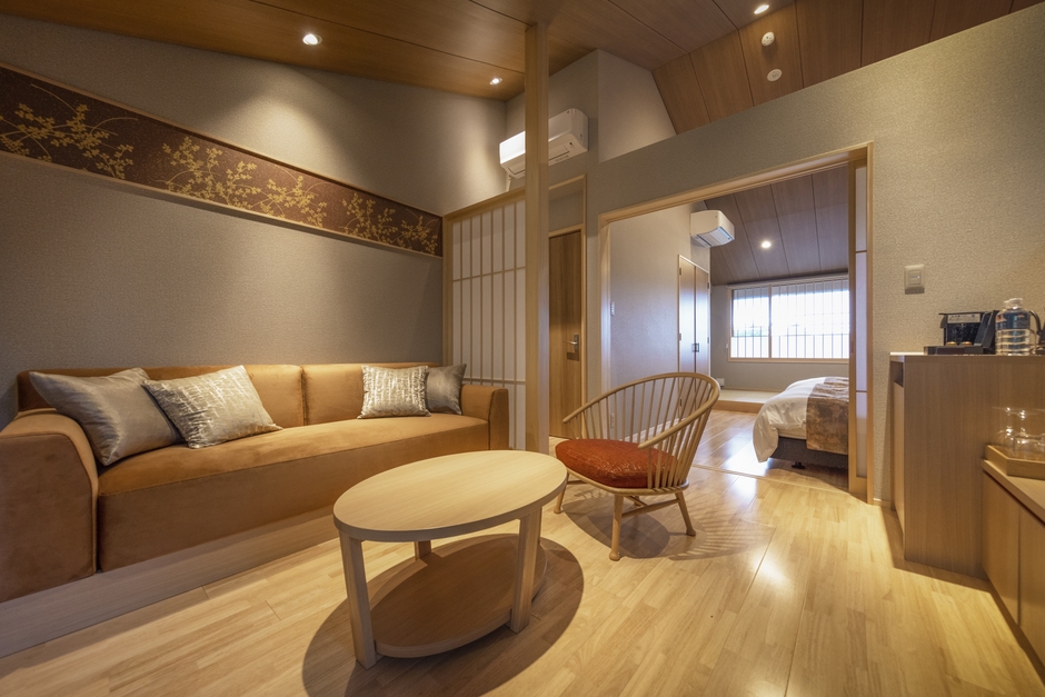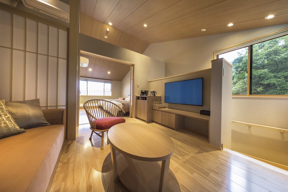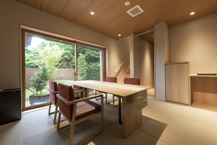 創作会石/お部屋出し1泊2食付プラン当館のお部屋は全てメゾネットタイプとなっております。1階はダイニング、専用庭園、客室半露天風呂、トイレ2階はリビング、寝室、トイレ3部屋全て玄関が異なり、庭園も各部屋専用の庭園となっている為、他のお客様と接する事なくプライベートな空間を愉しんでいただけます。晴れた日にはお部屋から秀麗な富士山が眺められます。ハリモミ純林が隣接している為、夜には鹿やキツネ等の野生動物と出会えるかもしれません。