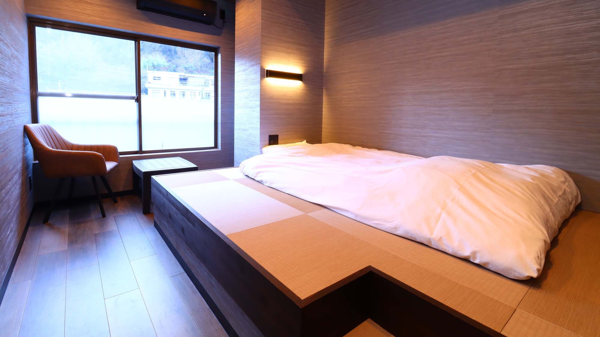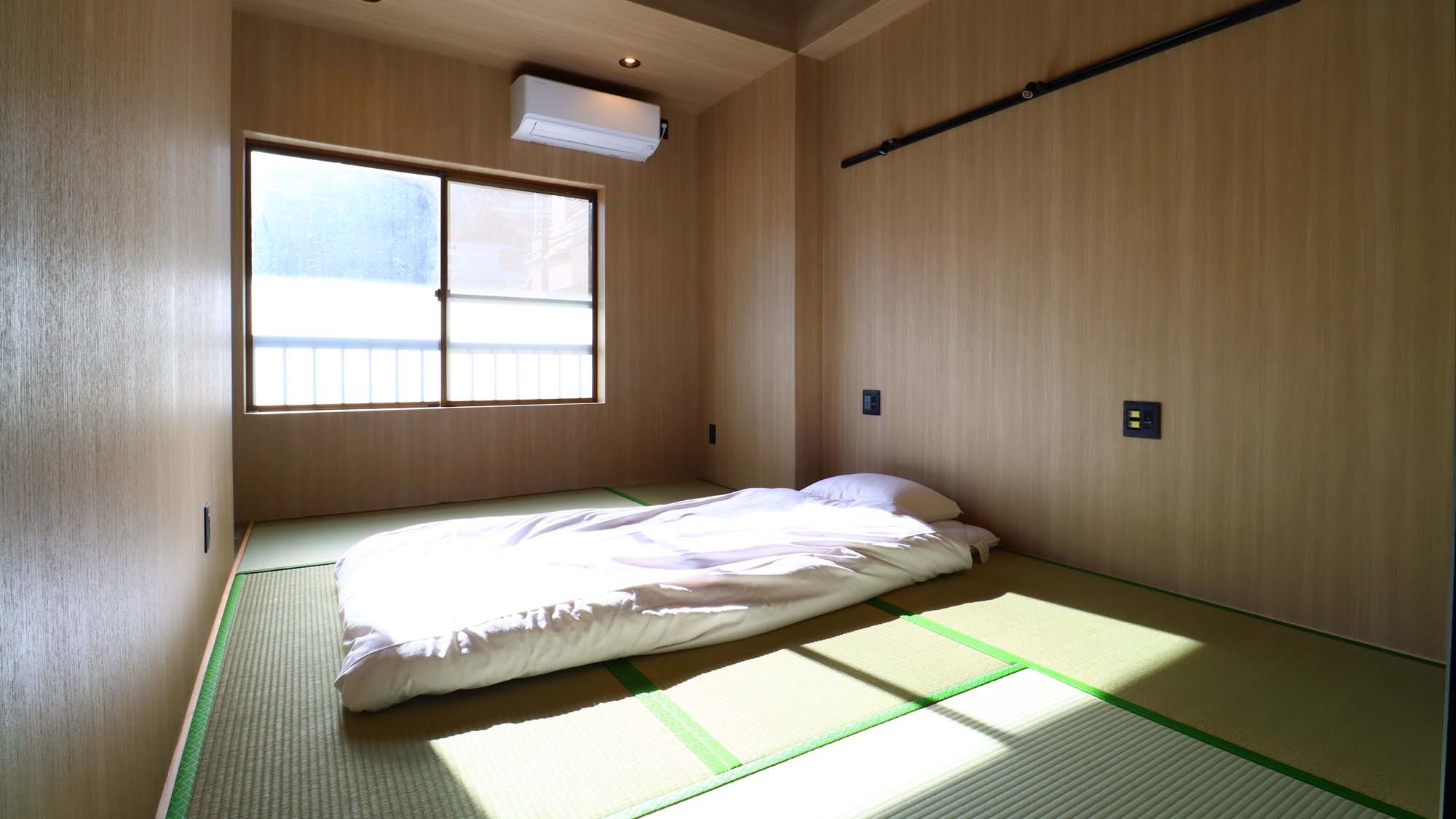 改装したシンプルな和室です。間接照明の電源とUSBポートが枕元にありますので、お布団に入ってからも快適に過ごせます。
