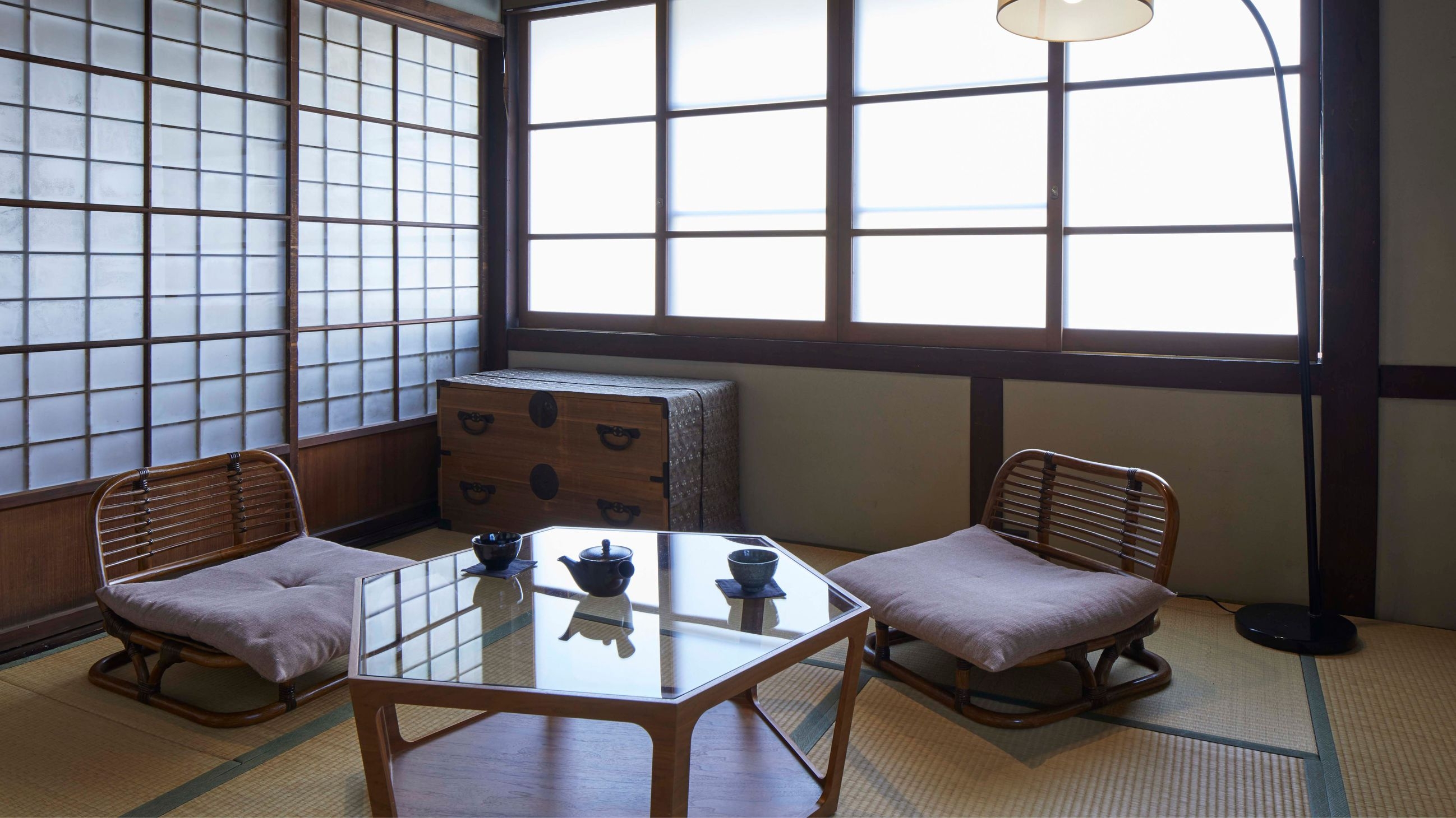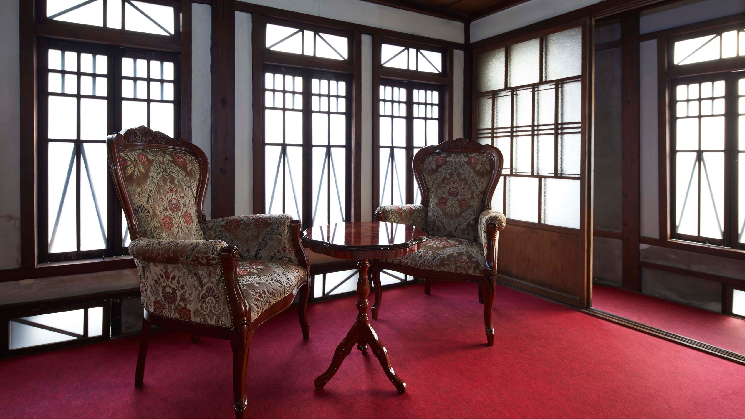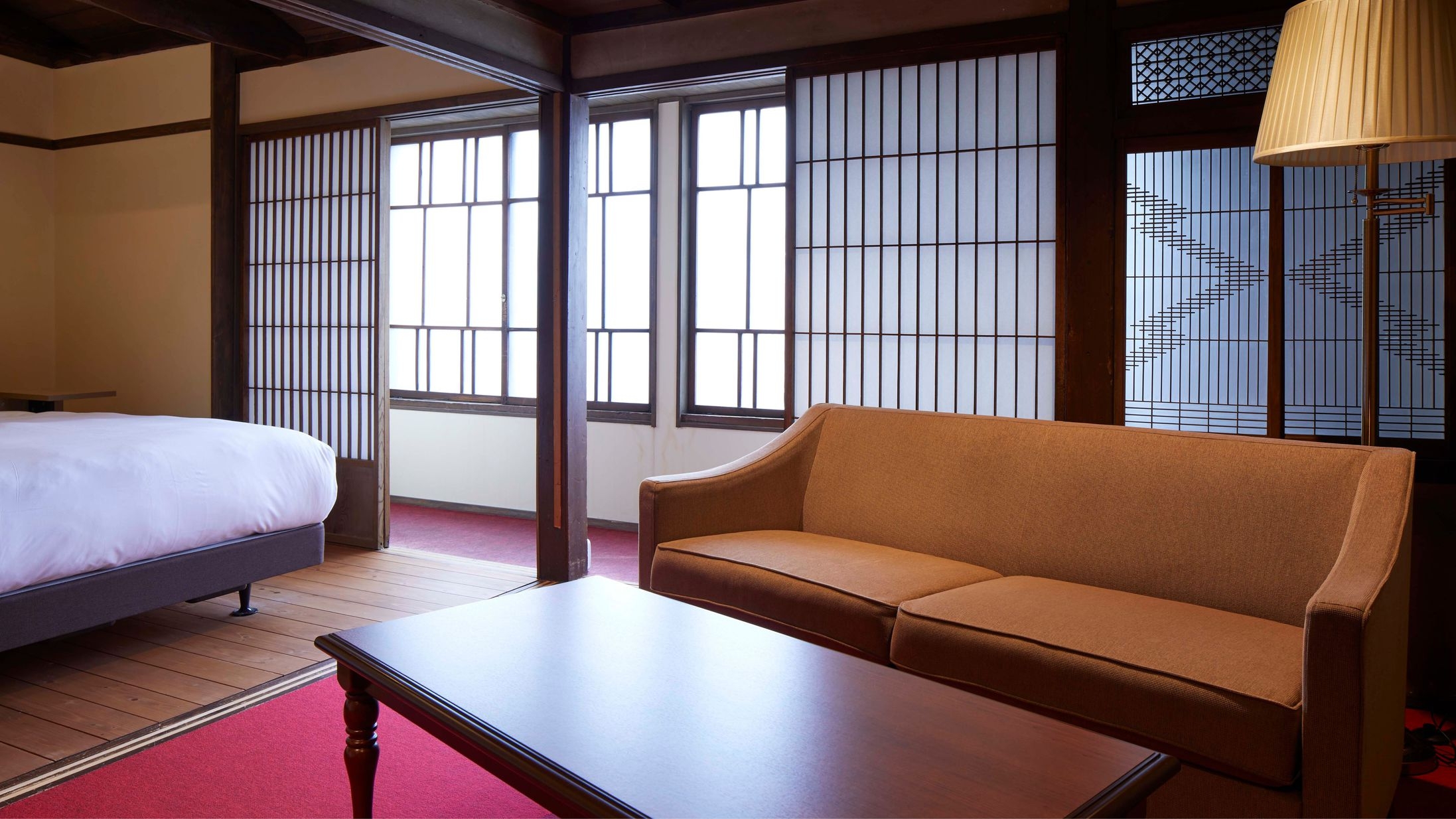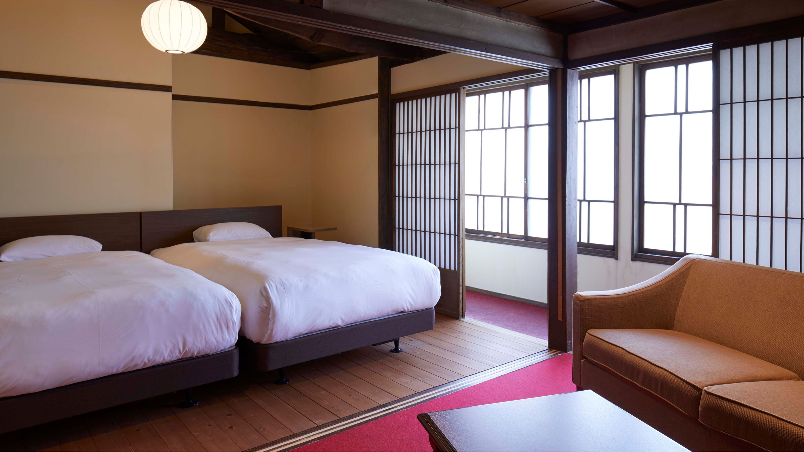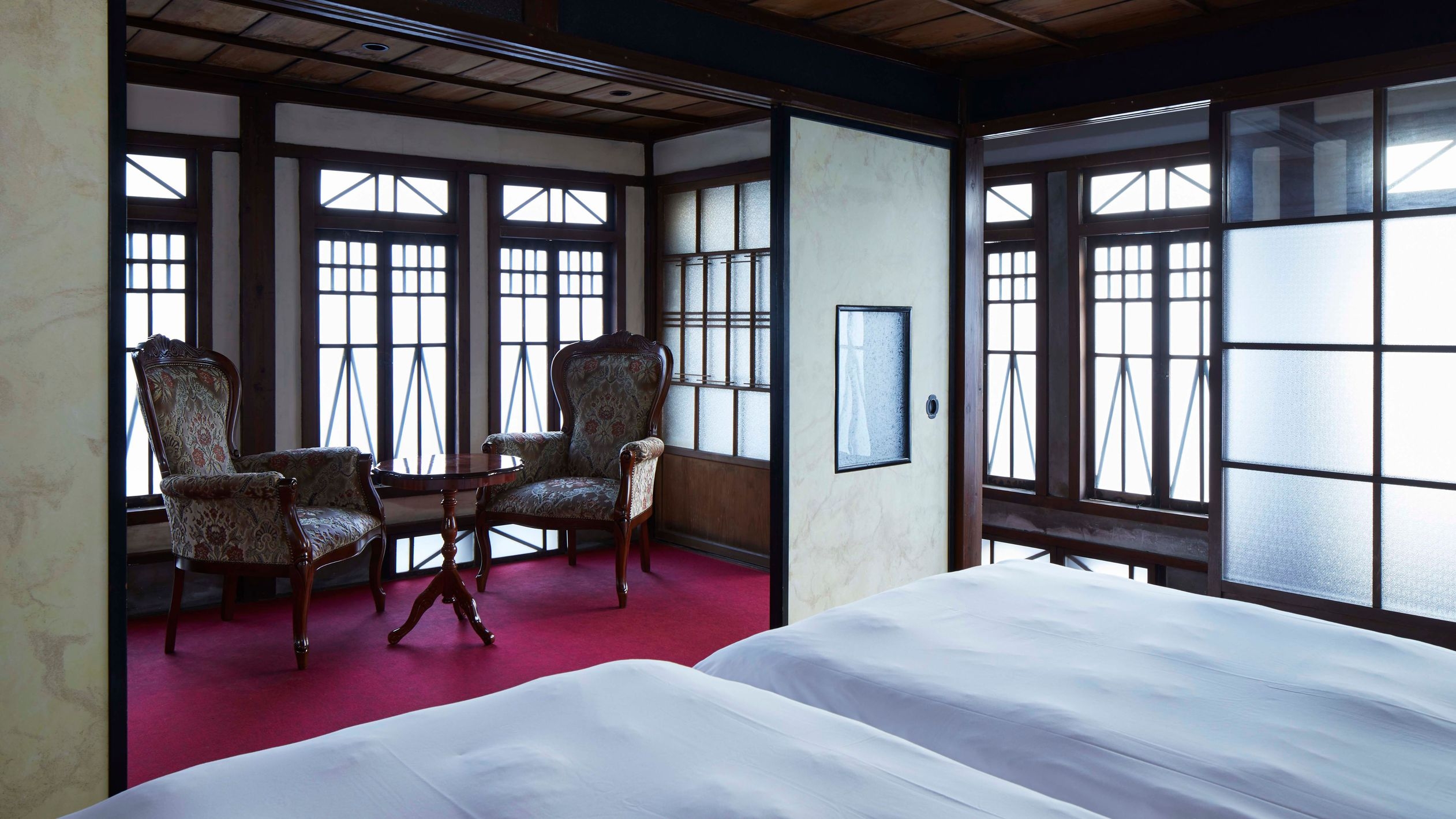 【メゾネット/ツイン/檜風呂】 登録有形文化財の「小池煙草店」内の客室。窓の格子から家具、赤いカーペットにいたるまで大正ロマンの世界感が漂います。