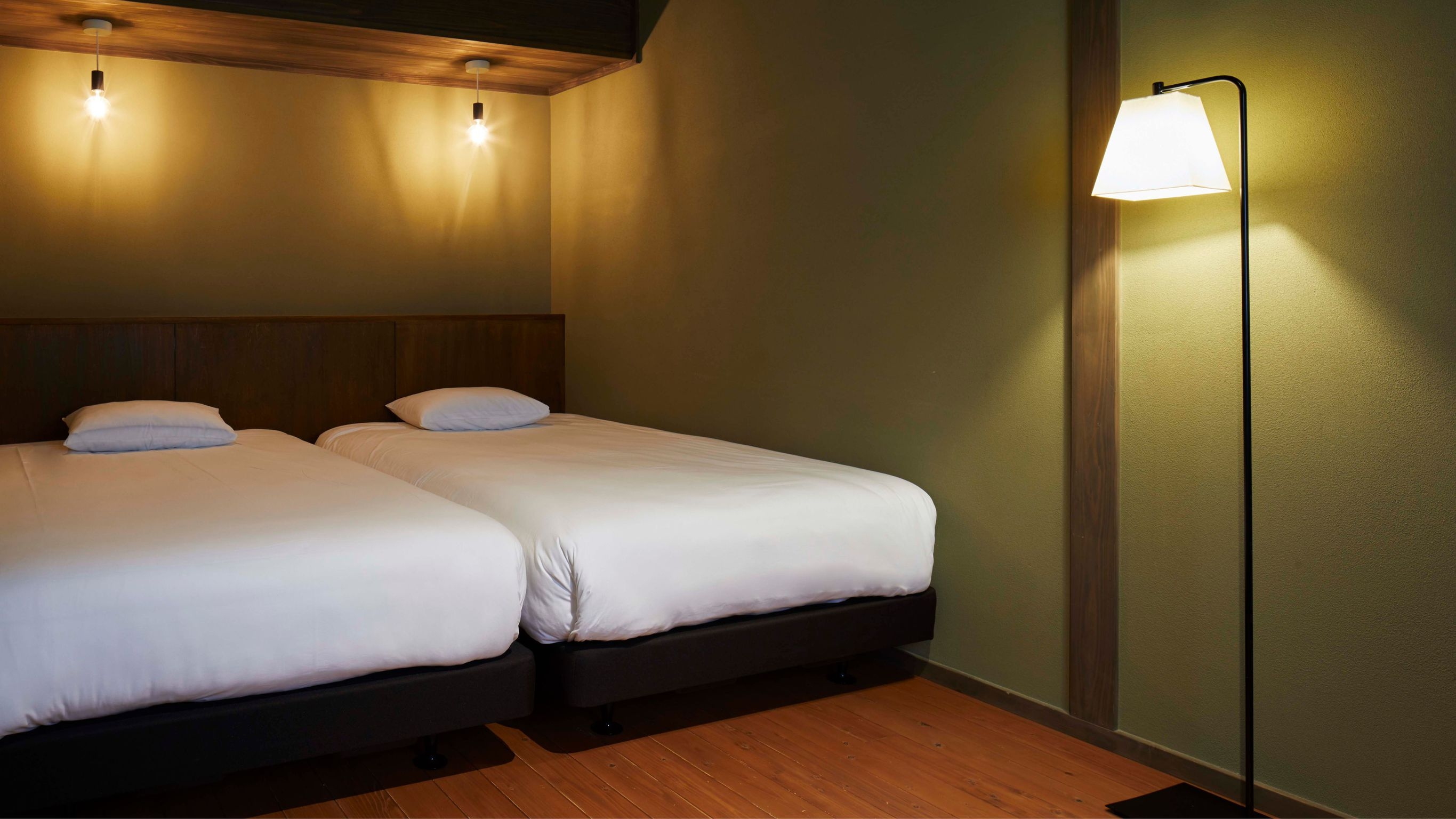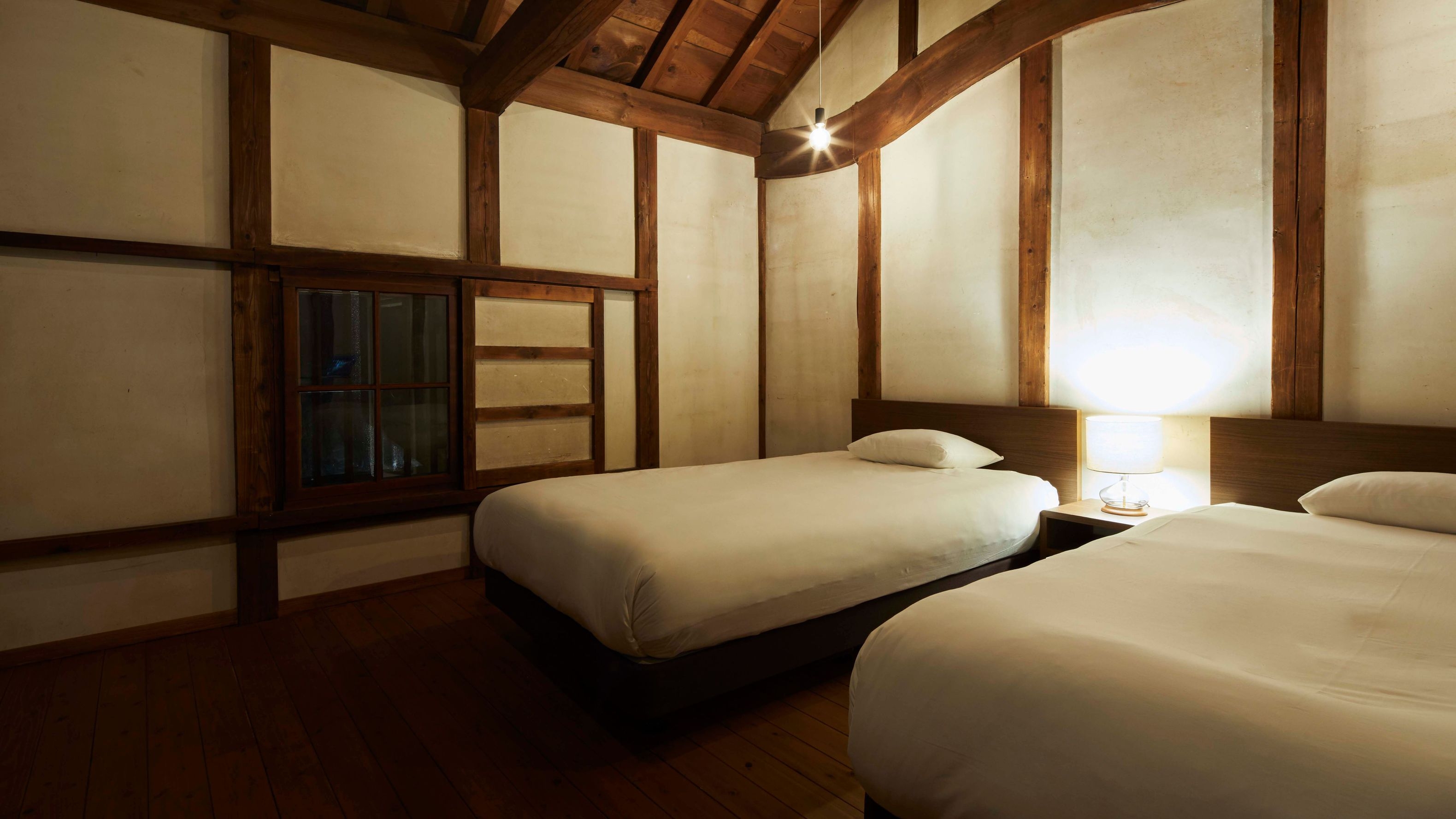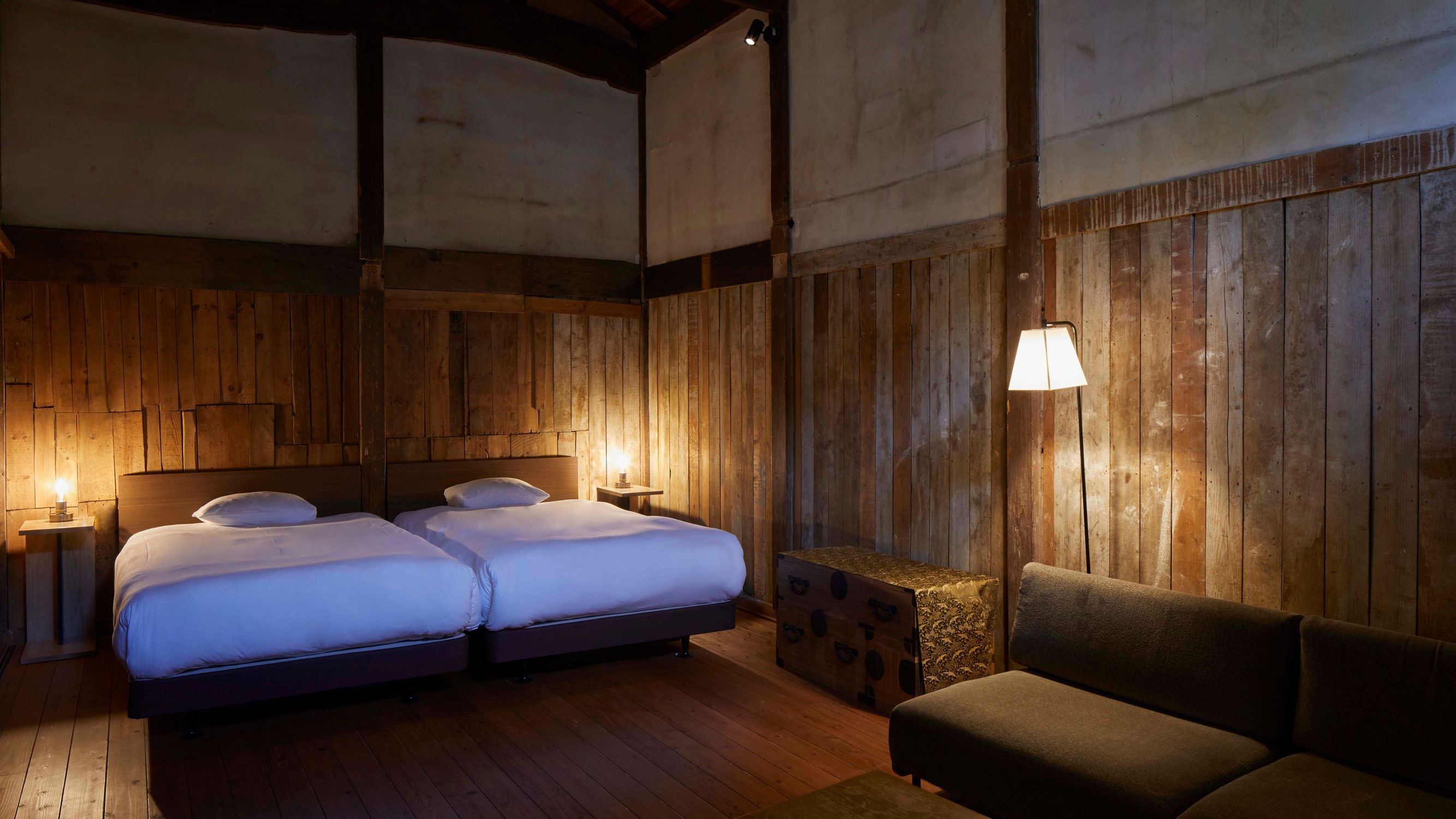 【蔵1階/ツイン/檜風呂】 壁や天井はできる限り当時のまま残し、そこにモダンなインテリアを採用し、シックながら落ち着きのある空間に仕上げています。