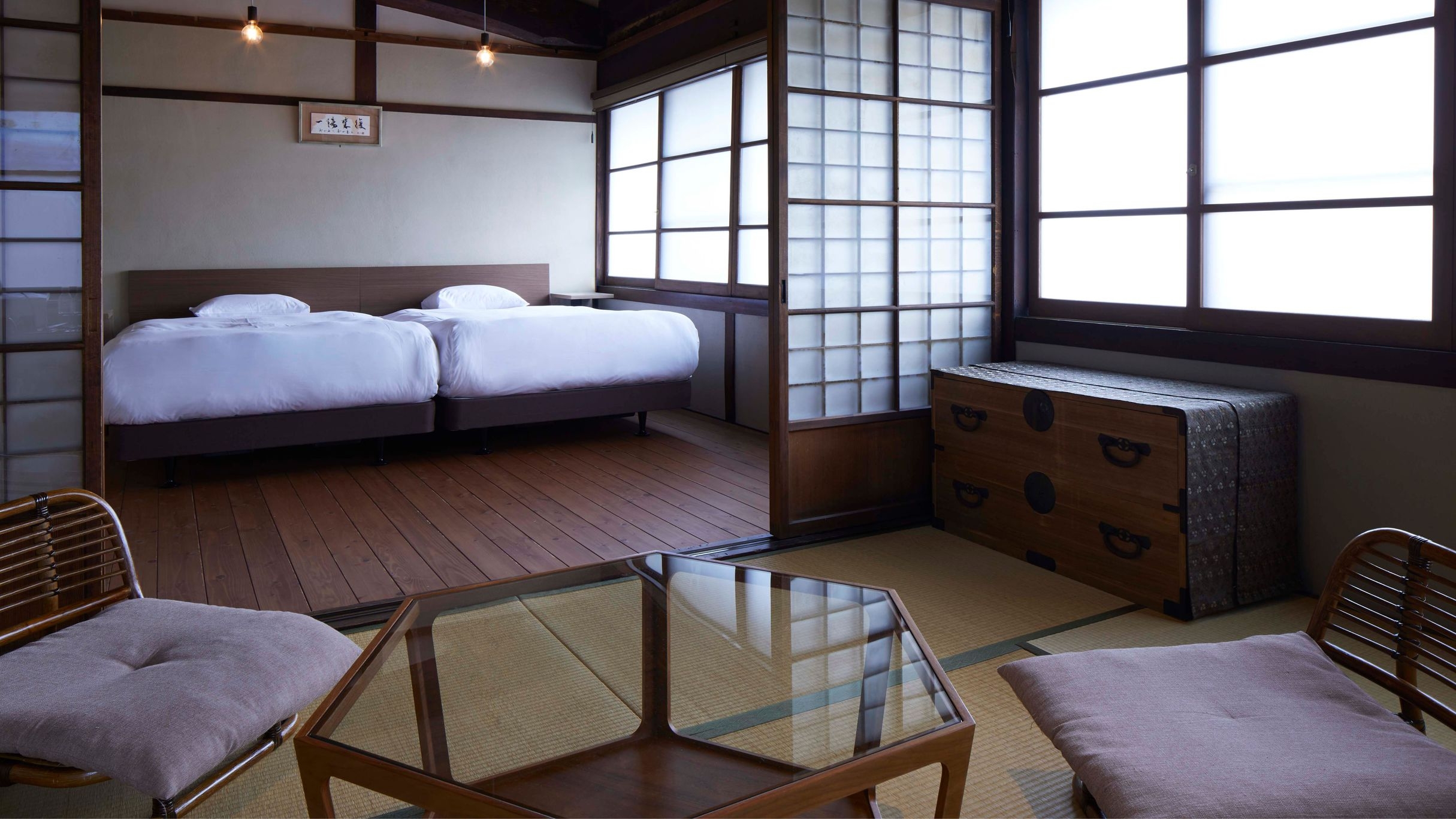 【2階/ツイン/檜風呂】 梁から箪笥まで昭和レトロを感じる懐かしくて落ち着く空間。二間続きで天井も高いため広々とお使いいただけます。