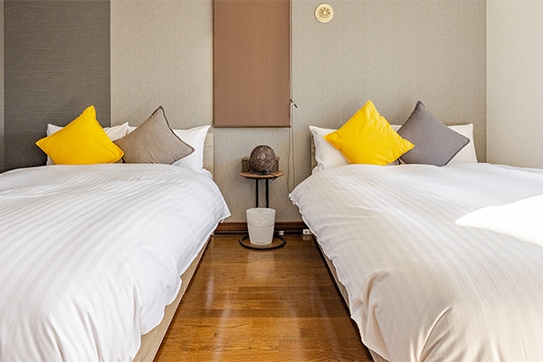 2階フロアに1室の贅沢なゆったり空間。寝室2室ダブルベッド3台・セミダブルベッド2台設置。ファミリーやグループに最適!※添い寝含め定員10名まで