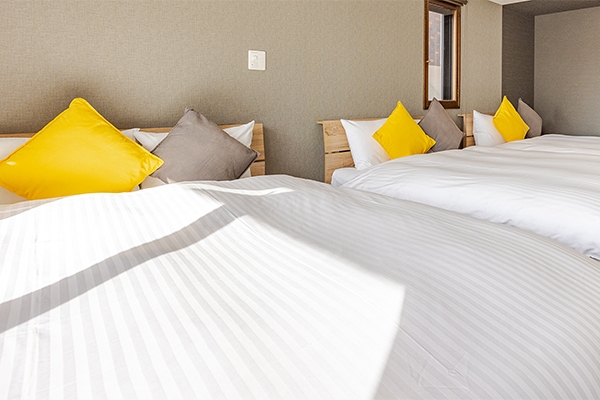 3階フロアに1室の贅沢なゆったり空間。寝室2室ダブルベッド2台・セミダブルベッド3台設置。ファミリーやグループに最適!※添い寝含め定員10名まで