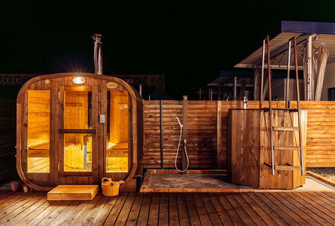ガス・薪2タイプのサウナ、水風呂、外気浴、採暖室まで揃い、滞在中はいつでも貸切利用。