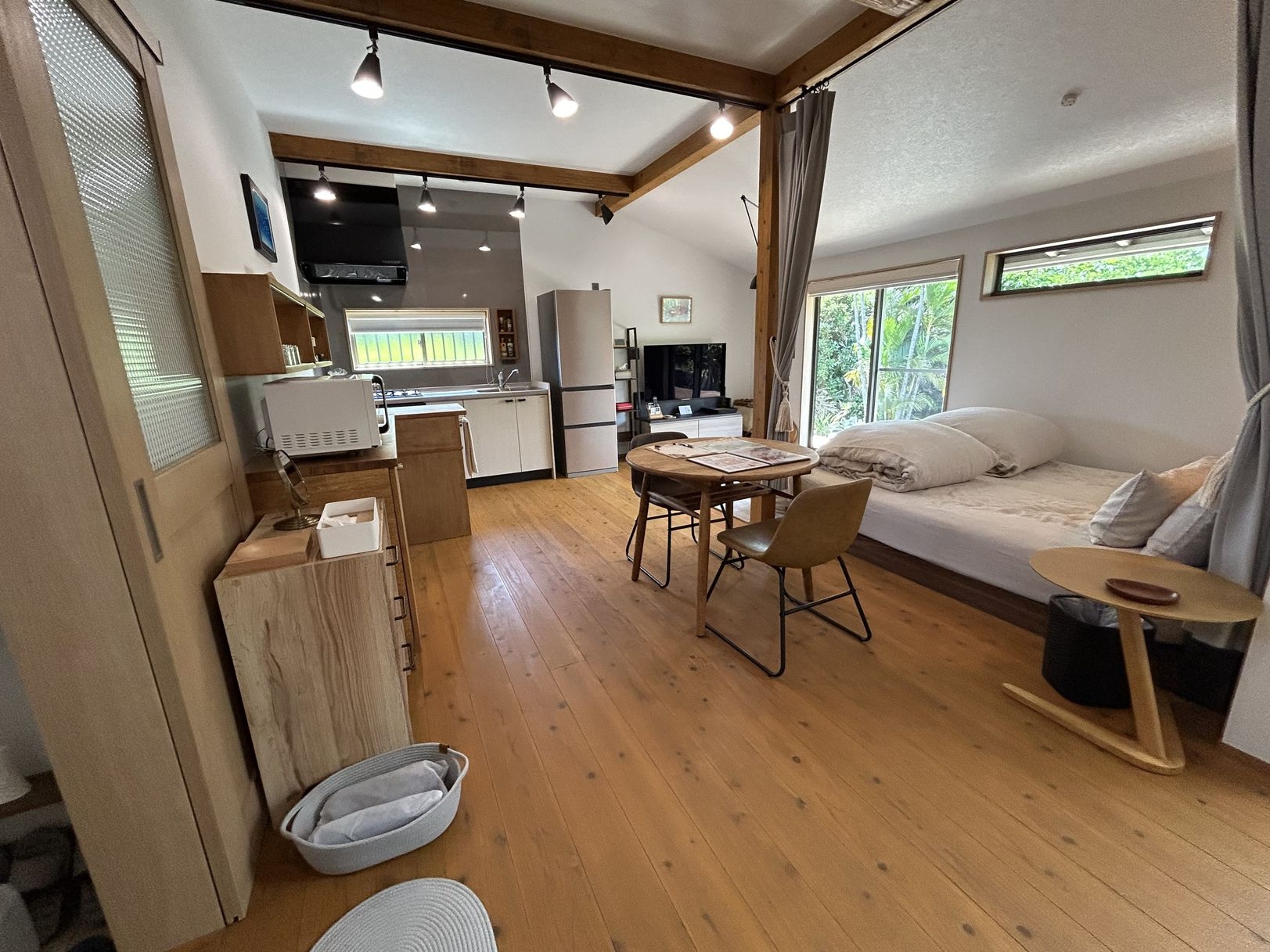 無垢杉板フローリンの30坪(3LDK)1棟貸しヴィラ。ツイン、セミダブル、和室完備。洗面所・トイレ各2箇所で、2家族でもプライベートを保てます。
