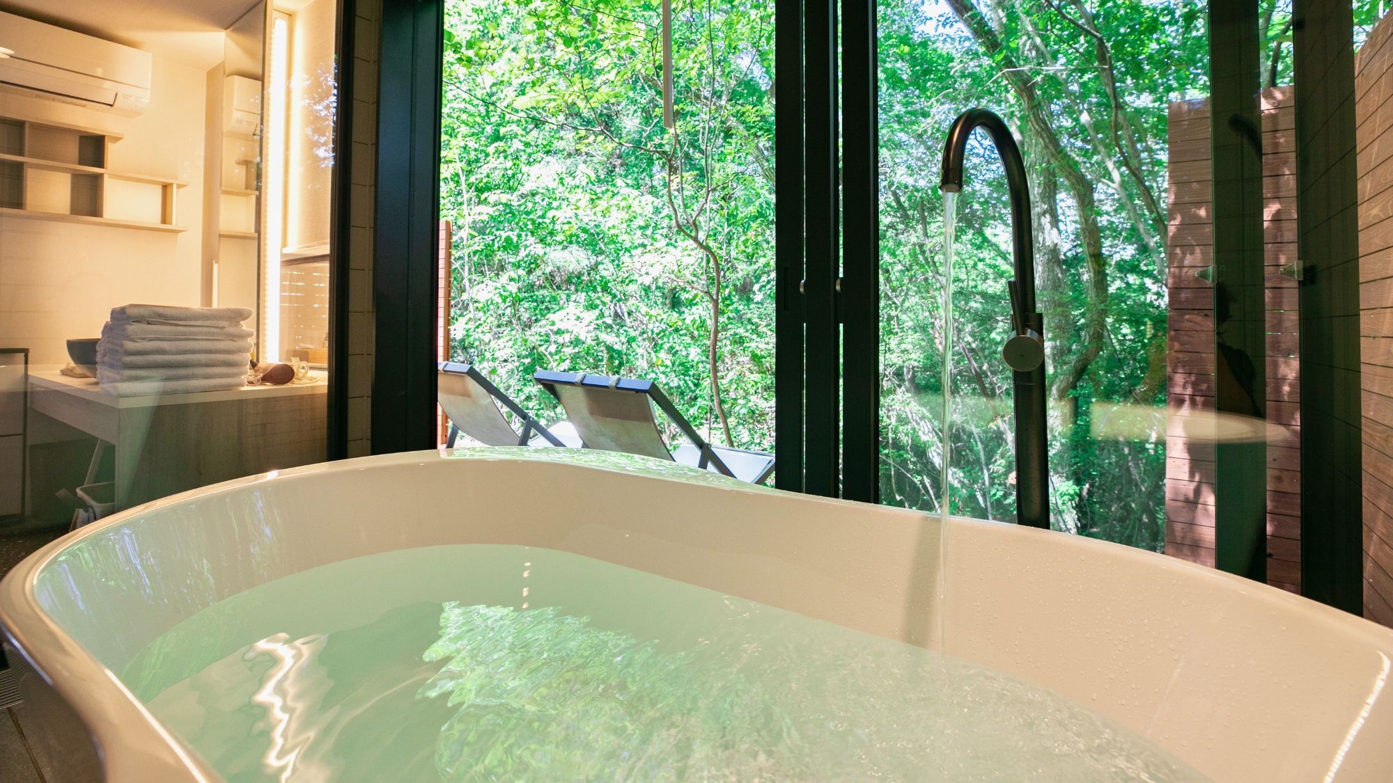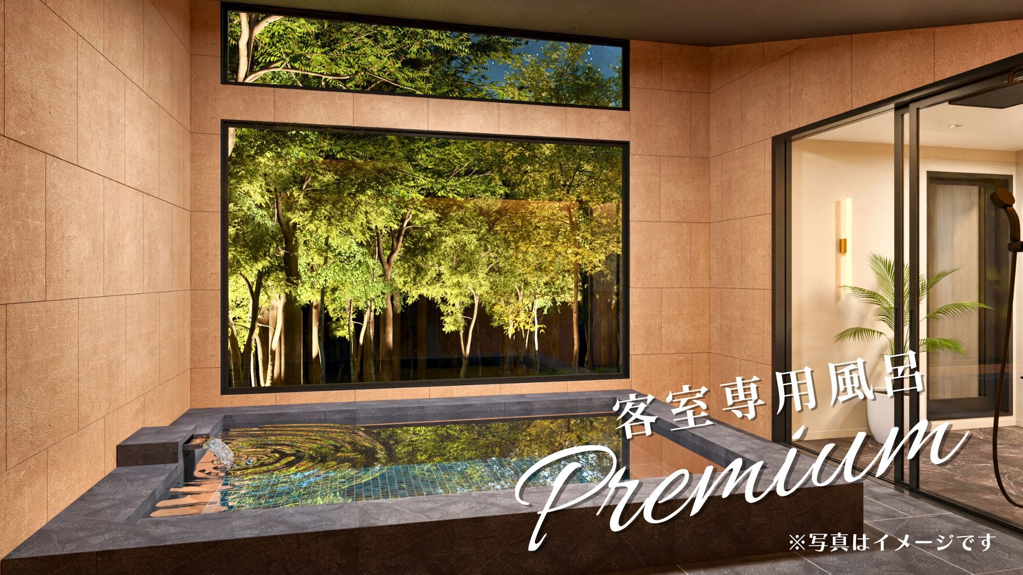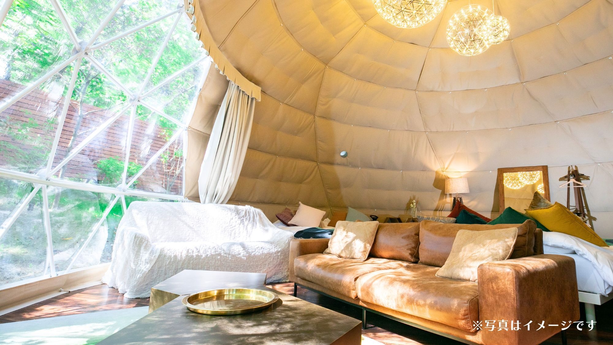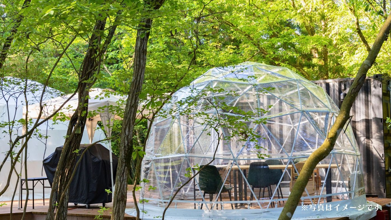 新登場のプレミアム・ドーム8mは、他棟から離れた静域に設けた贅沢な一室。昼は木漏れ日、夜はライトアップされた森を大きな窓のビューバスから24時間楽しめます。
