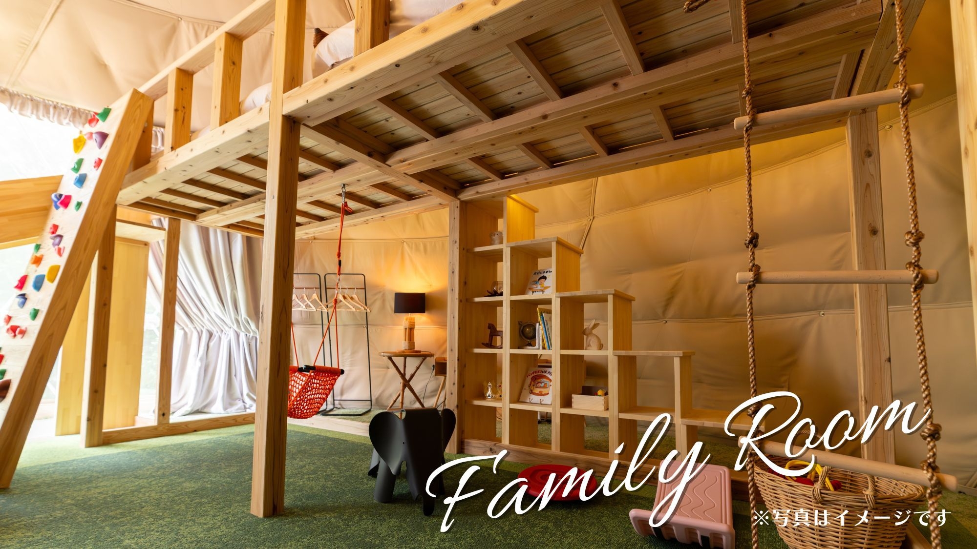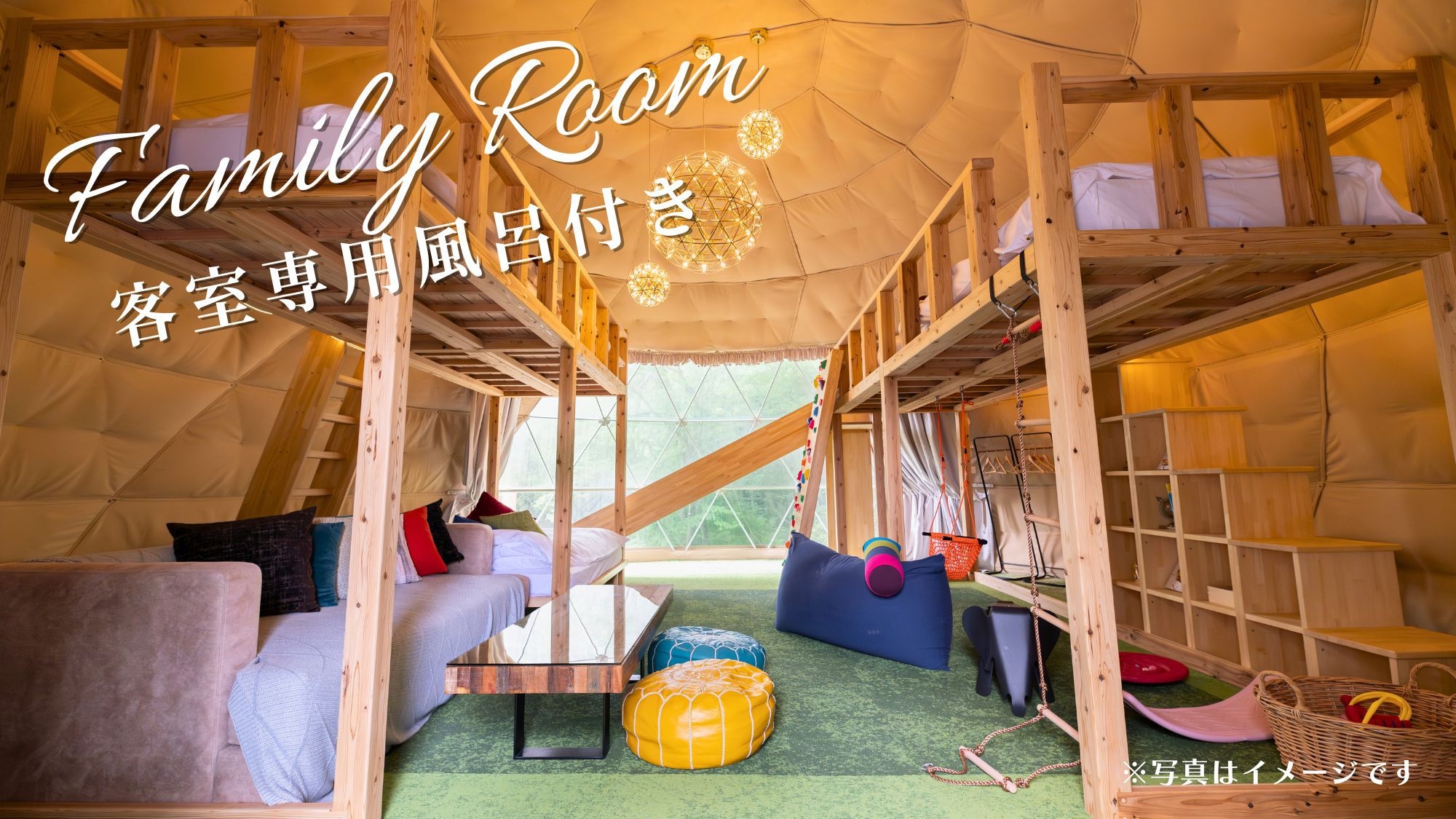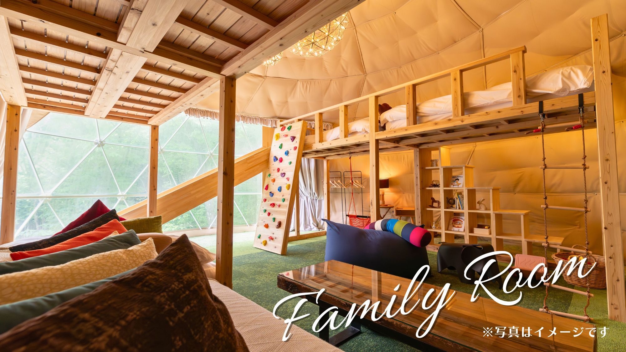 2025年11月22日から「キッズパーク付きのファミリールーム」としてリニューアルしました! 最大7名まで泊まれる8mの大型ドームテント