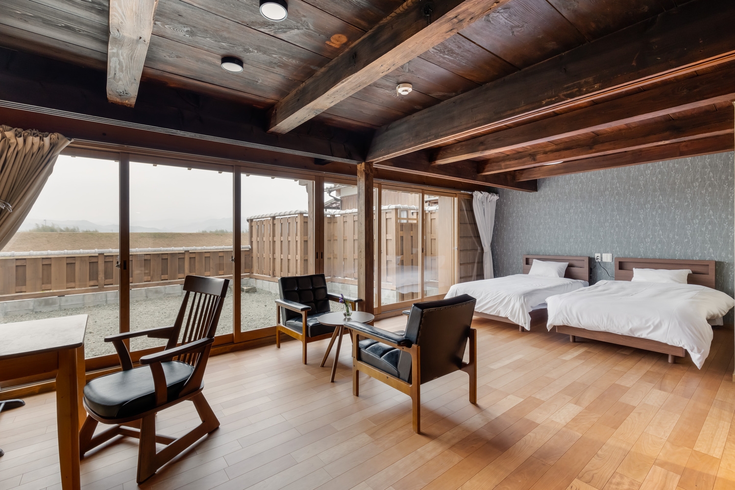 落ち着いた和モダン空間に、シングルベッド2台を配置したツインルーム。 カップルやご友人との滞在に最適です。 専用のシャワー・トイレ・洗面付き。