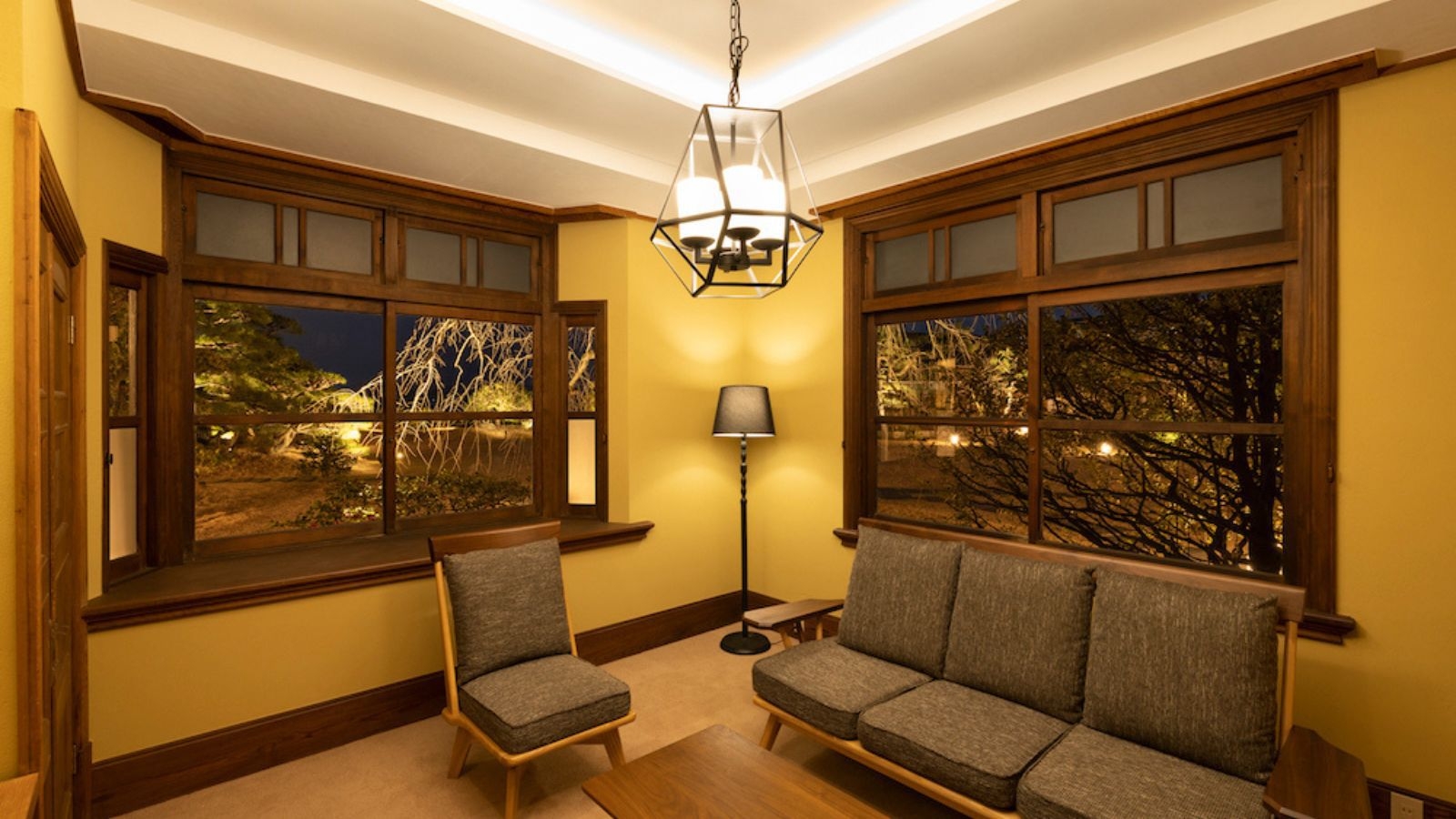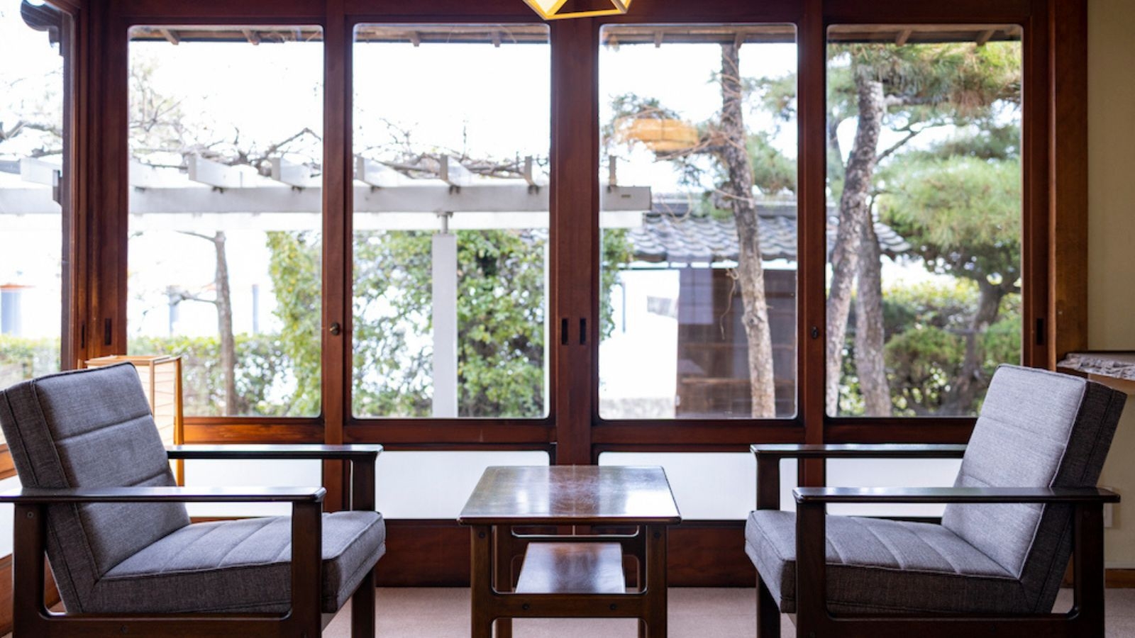 開放的な眺望窓からは施設で唯一庭園を全体的に眺めることが出来る居間と最大2名様までのご案内が可能な寝室。