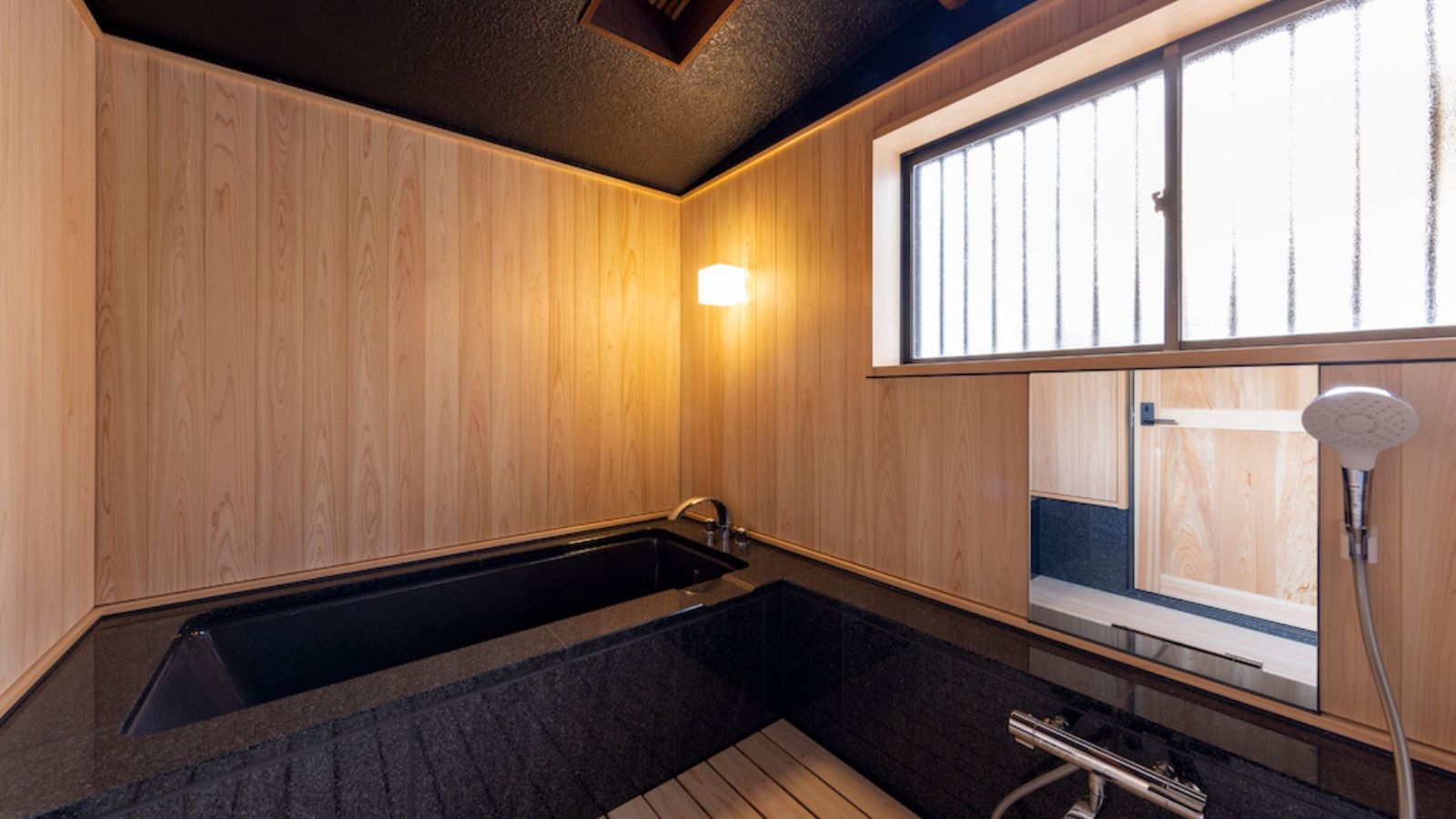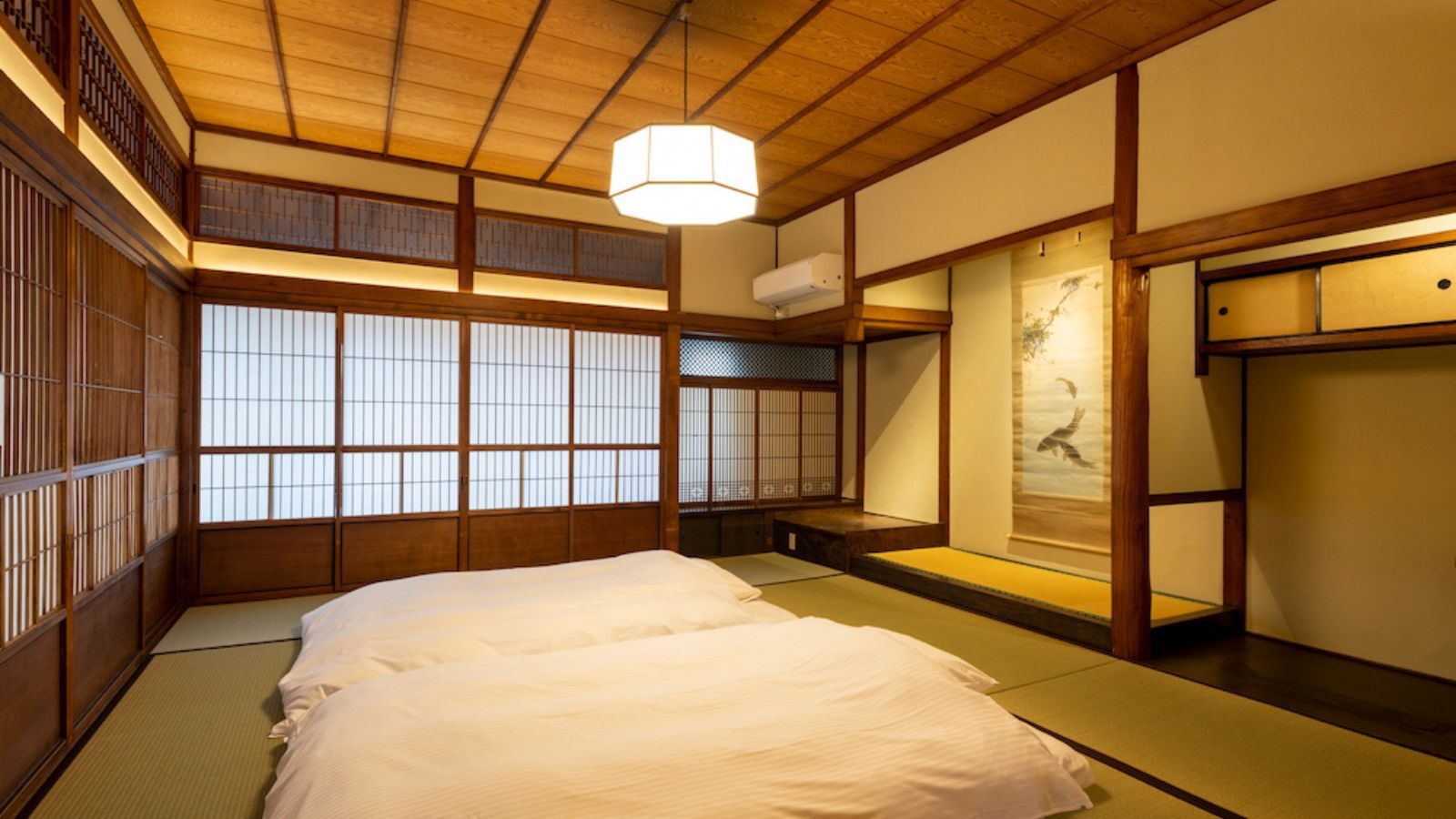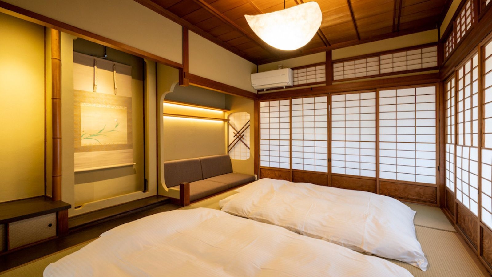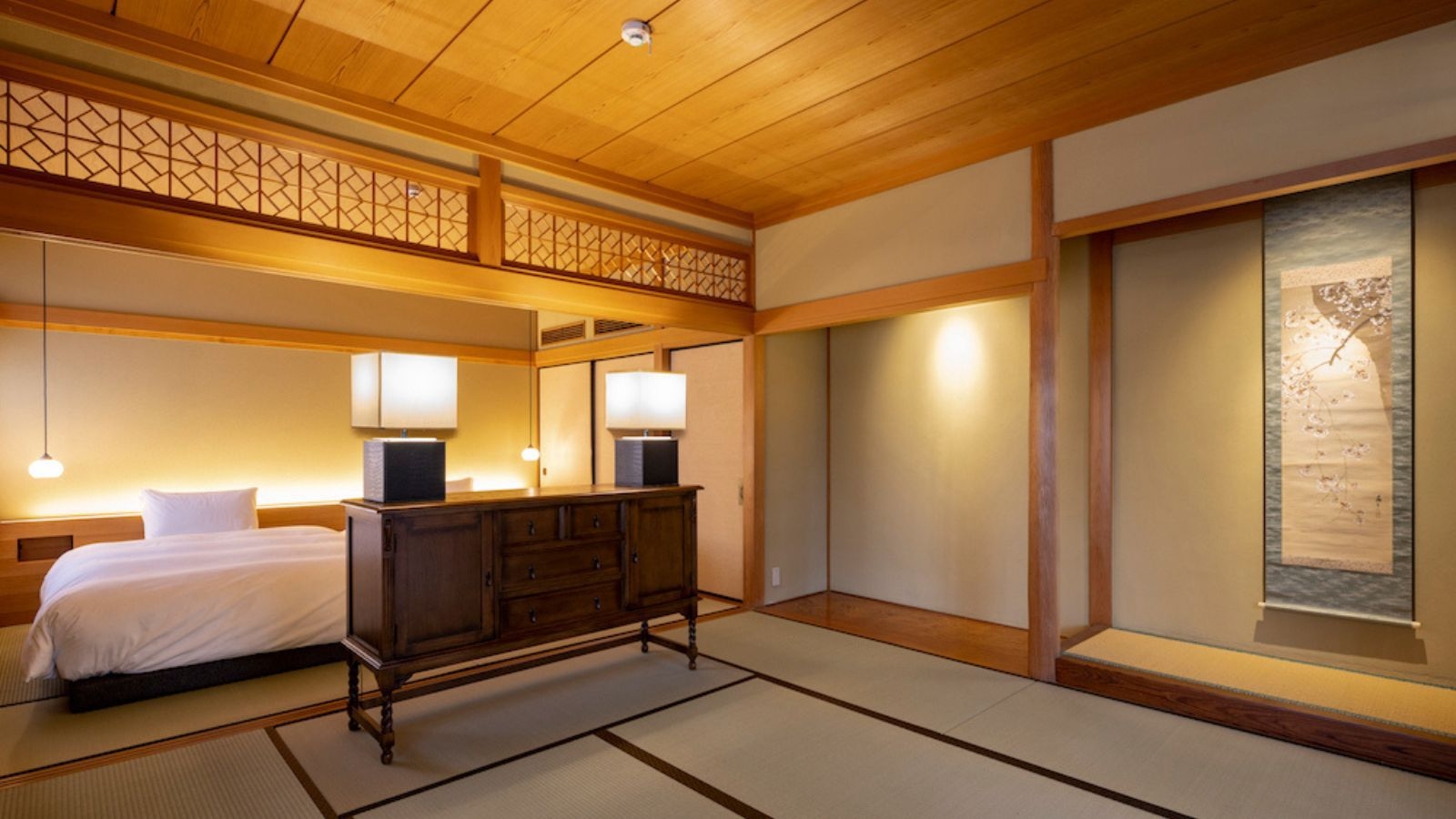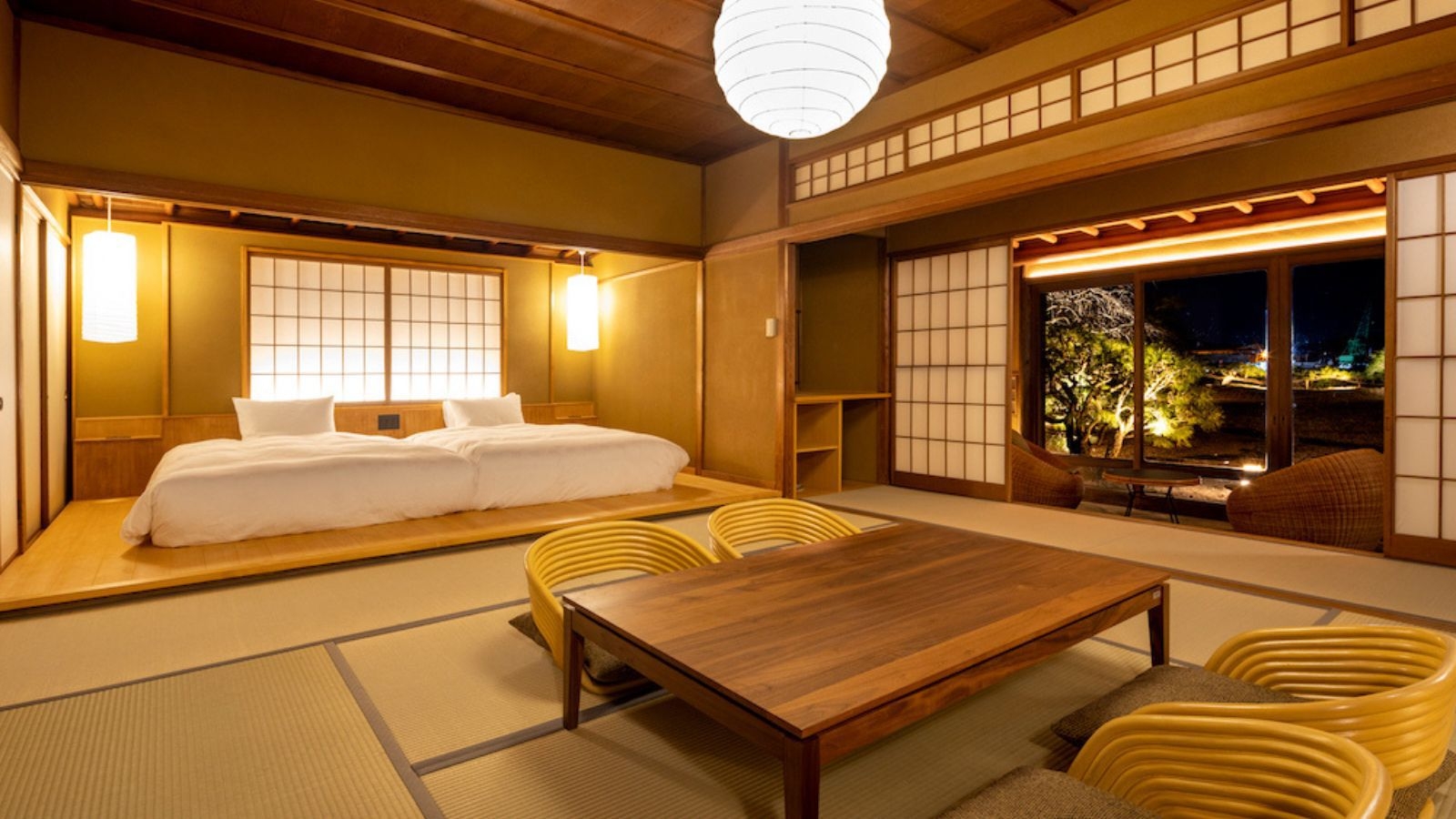 露天風呂と内風呂の檜風呂を備えた古民家風の寂びた空間が味わい深い和室。 ふんわりとしたお布団で最大4名までご案内可能です。