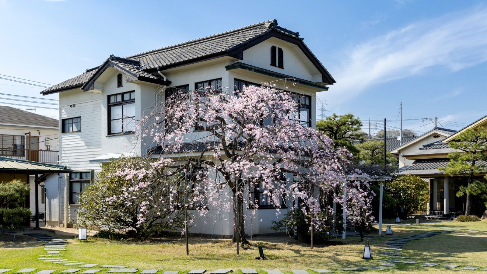 大きな枝垂桜を前にゆったりとしたソファのある居間で和モダンに仕上げた客室。畳に布団を敷いた最大4名までご案内可能です。