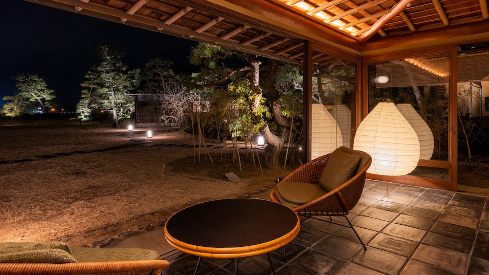「引き船」で運ばれてきた「茅葺屋根」が特徴ある佇まい。 庭園をより感じることができる開放的なたたき。畳に布団を敷いて最大4名までご案内可能です。