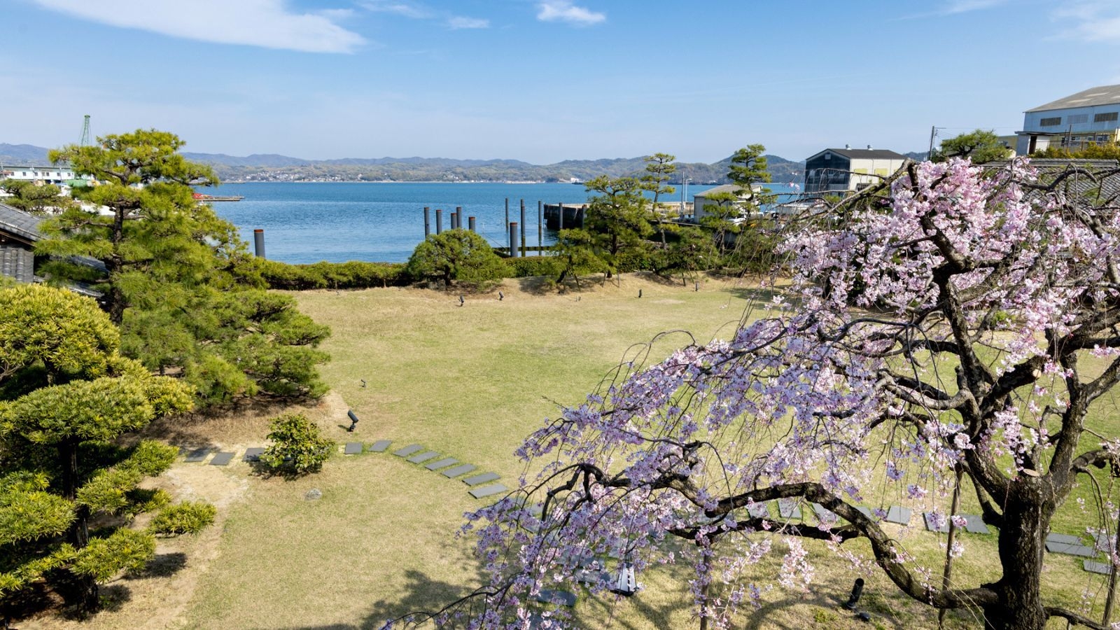 「引き船」で運ばれてきた庭園と瀬戸内海を望む落ち着きのある客室。ふんわりとしたお布団で最大3名迄ご案内可能です。