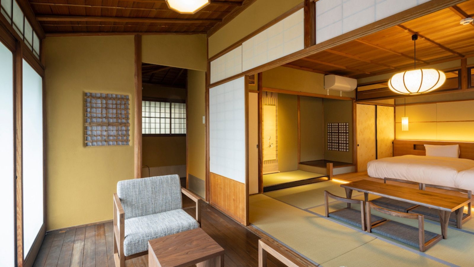 茶室を備え茶園文化の風格を感じさせる佇まい。庭園から入り込んだ客室はプライベート空間で滞在をお楽しみいただけます。畳に布団を敷いて最大4名までご案内可能です。