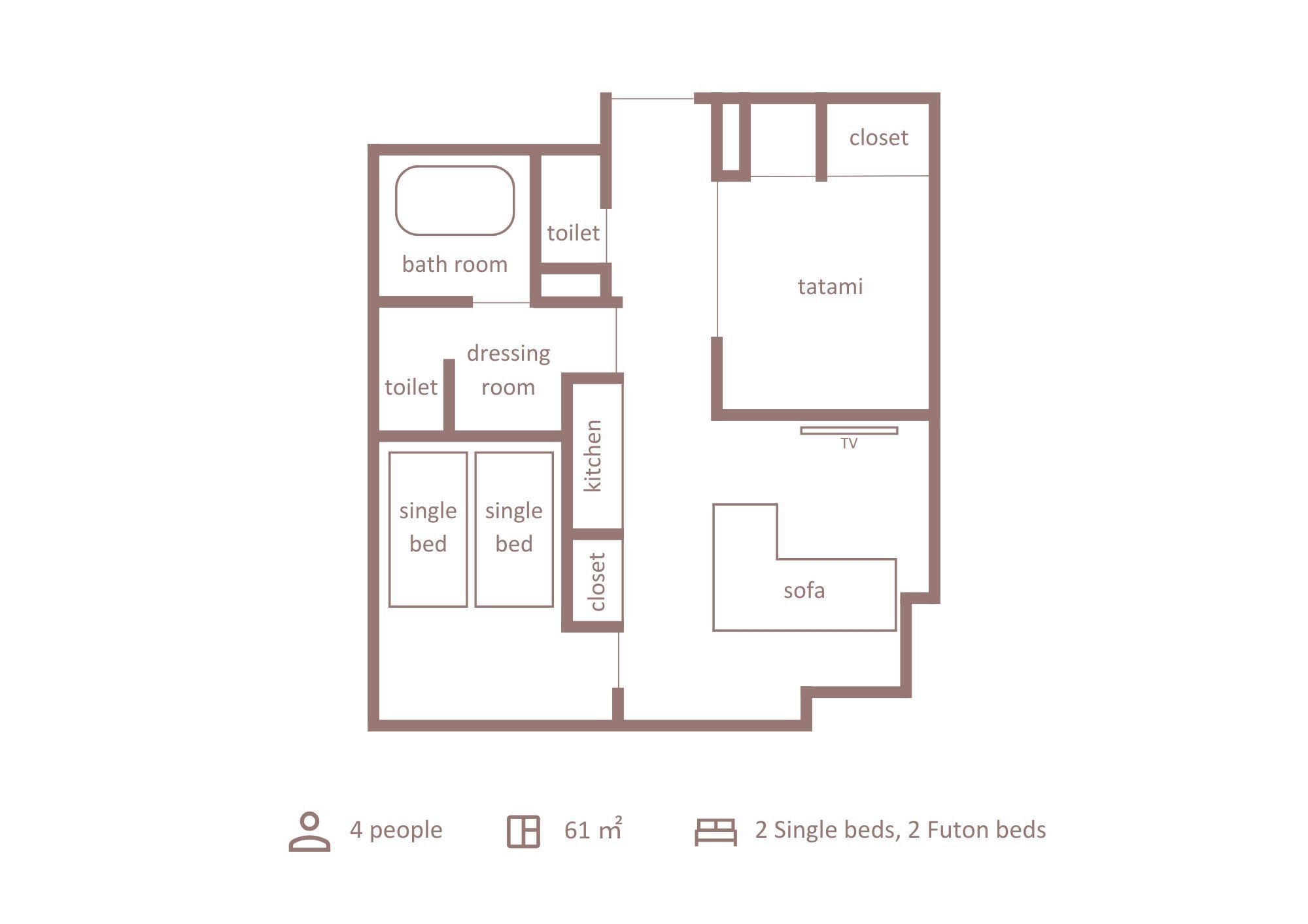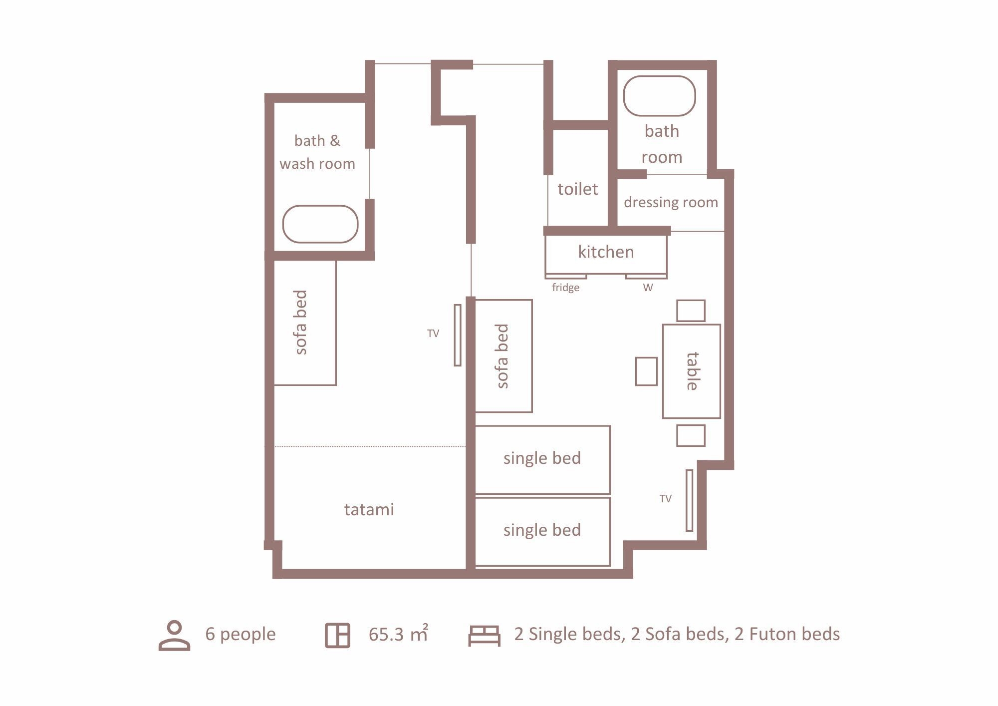 61平米のスイートルームで、シングルベッド2台の主寝室+畳和室に布団2組+リビングルーム。バスはジャグジー付きです!