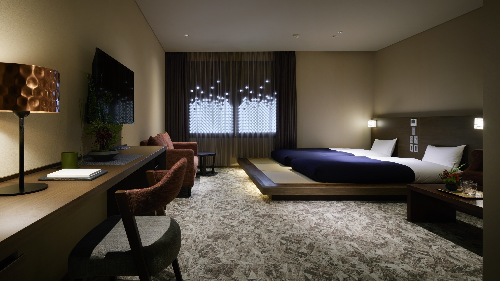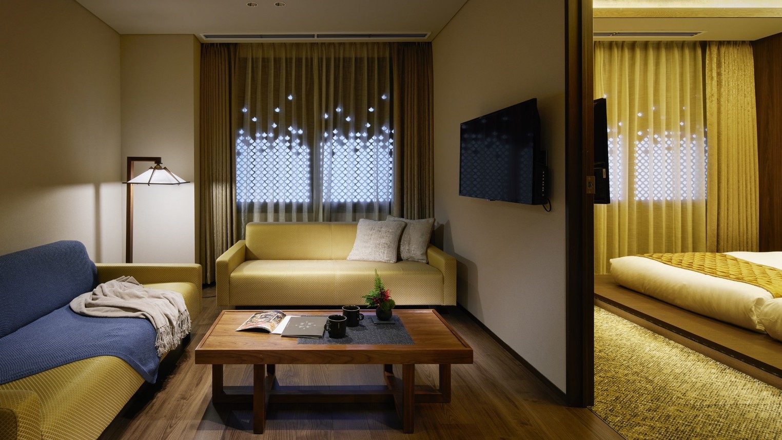 デラックス3ベッドとモデレート3ベッド Japanese Style Aのコネクティングルームで、お昼は部屋をつなげて、夜は独立したお部屋で使えます。