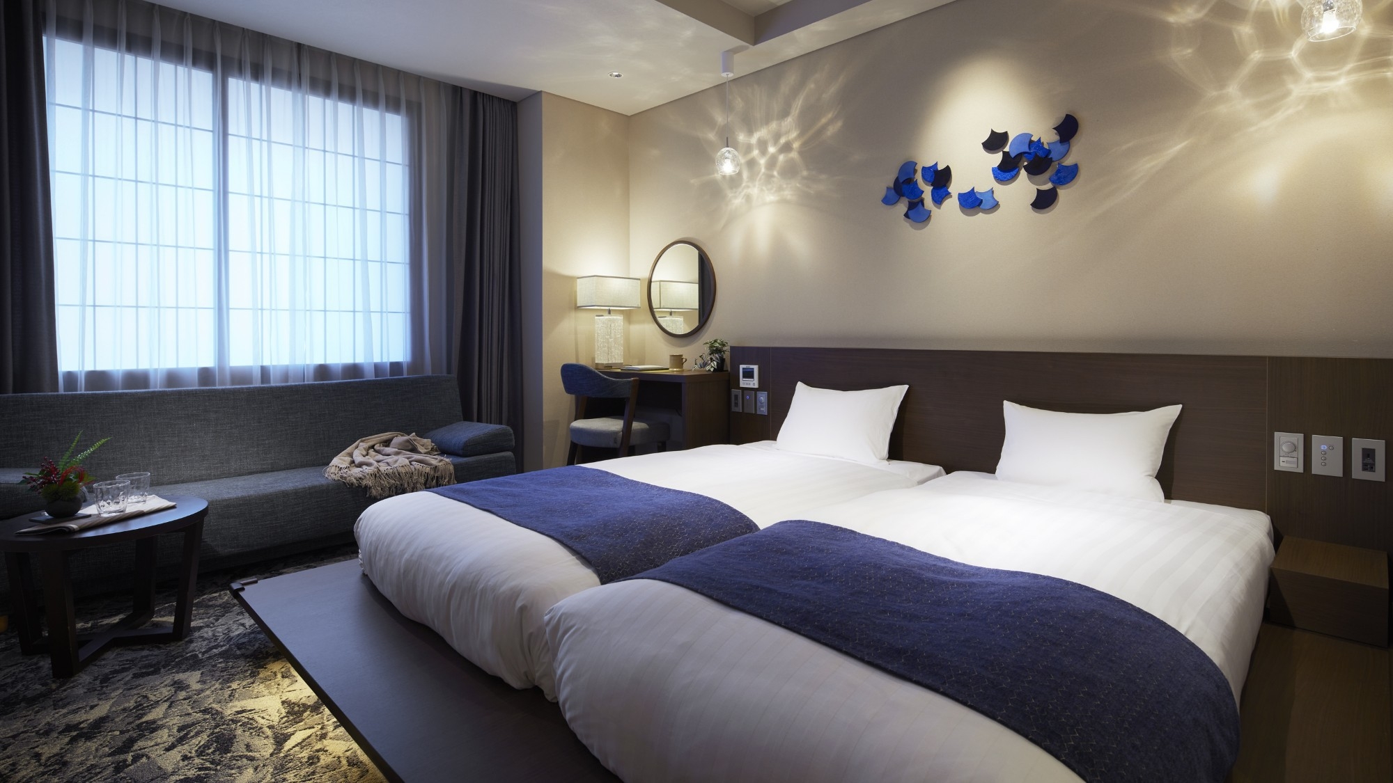 シングルベッド2台にソファーベッド1台があり、ご家族でのご宿泊に適しています。デスクもあるお部屋です。