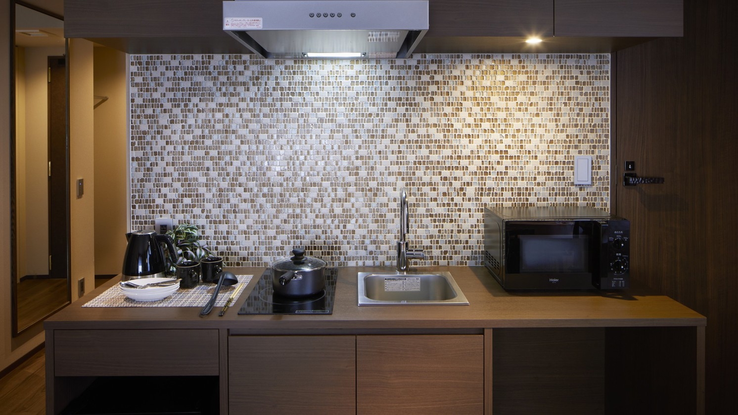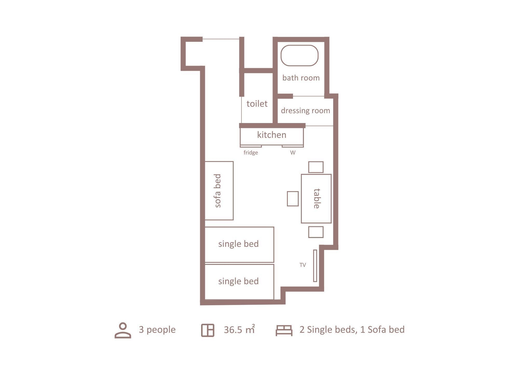 キッチン、ダイニングテーブルがあり、暮すように泊まれるお部屋です。シングルベッド2台+ソファーベッド1台で3名様までご利用いただけます。