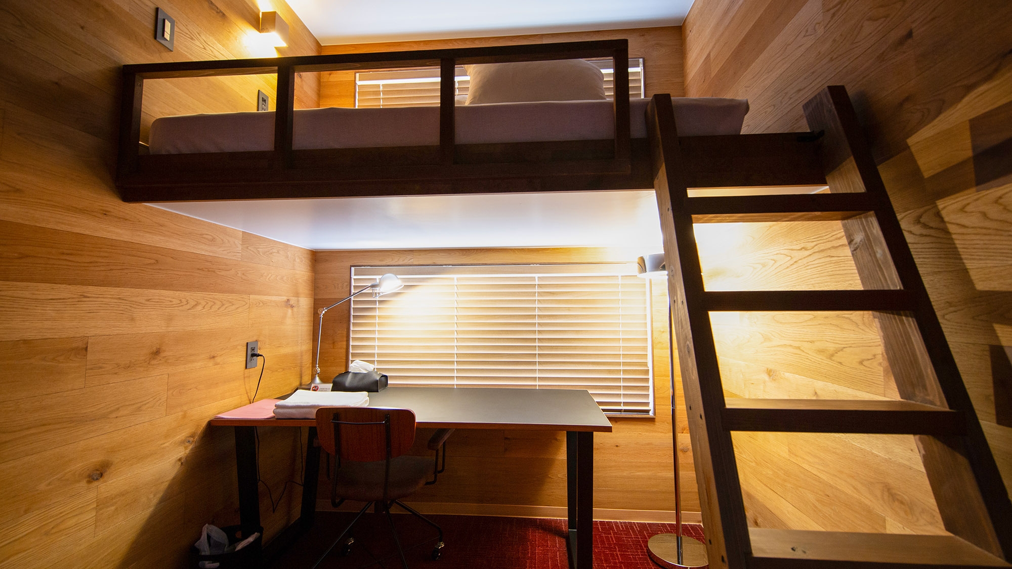 デスク付ロフトベッドを設置したドミトリールーム。ベッドはセミダブルサイズ。快適さとプライバシーを兼ね備えた空間です。共用設備:シャワー、トイレ、キッチン、洗濯機