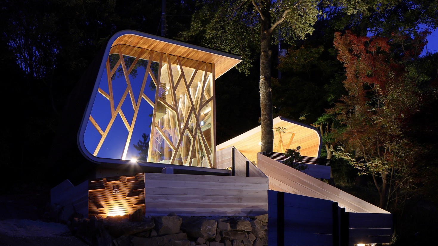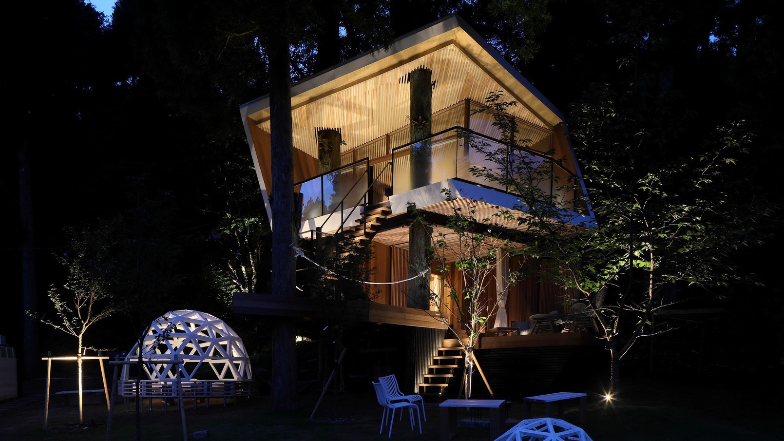 5本の杉の木の間につくられた3層の床を持つツリーハウスはSUGOMoRIリゾート生野高原のシンボルとなる貸別荘です。