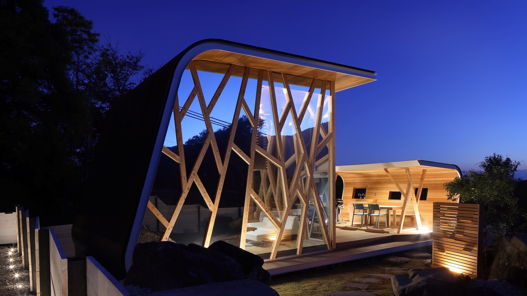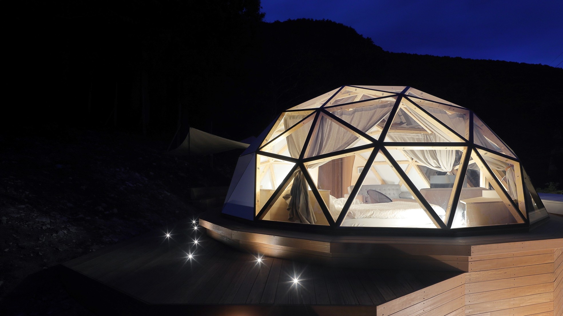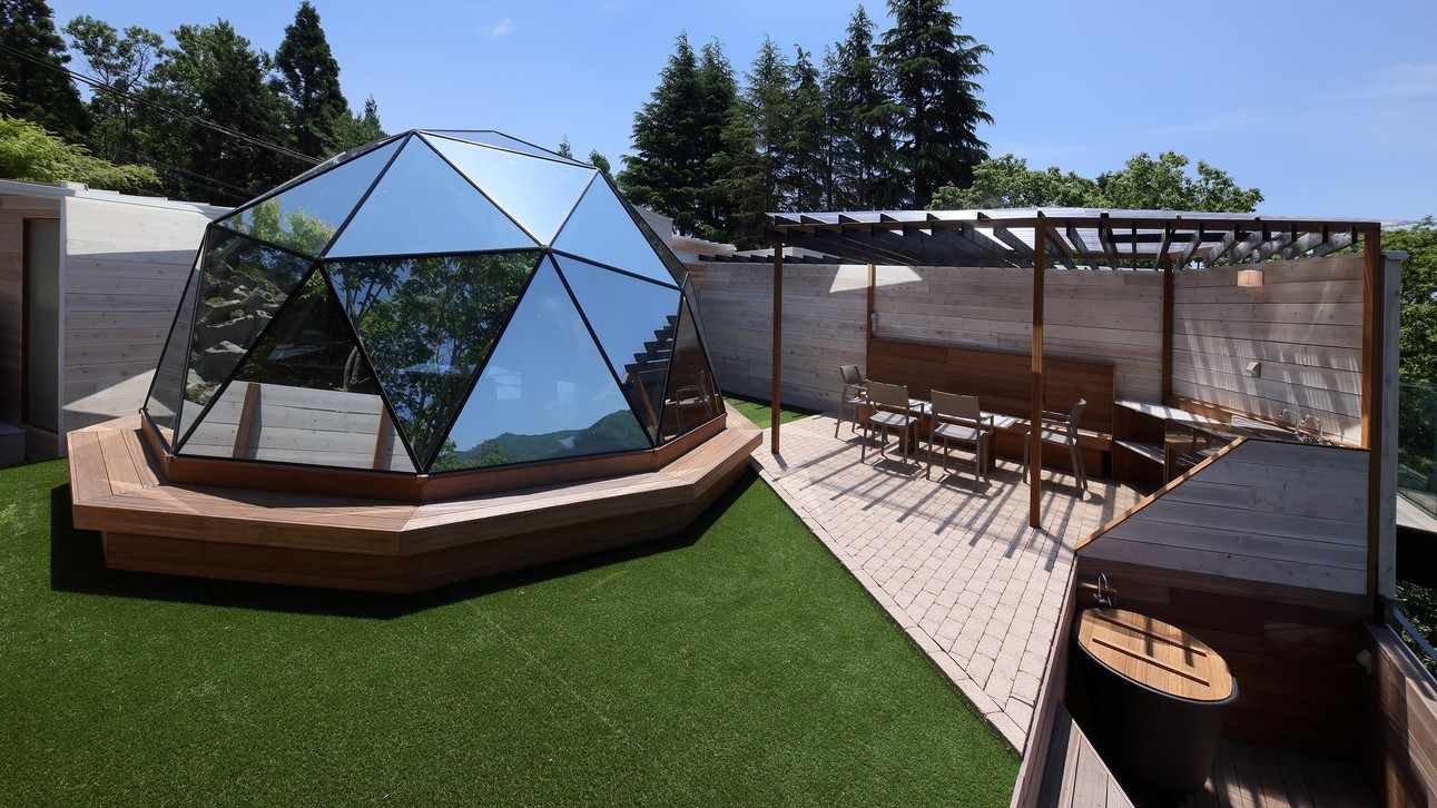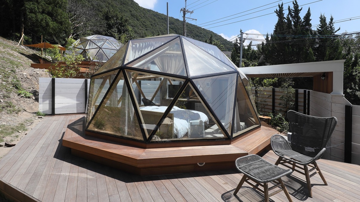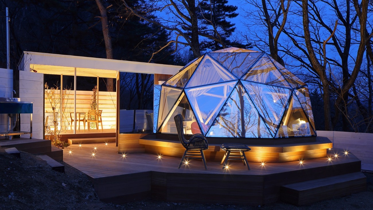 直径5メートル全面ガラス張りのドーム棟と、アウトドアリビング、シャワー、トイレを設置したユーティリティ棟から成り立つ建物となっております。