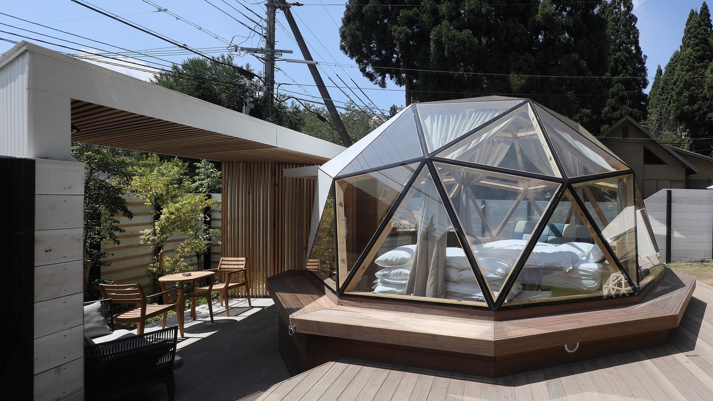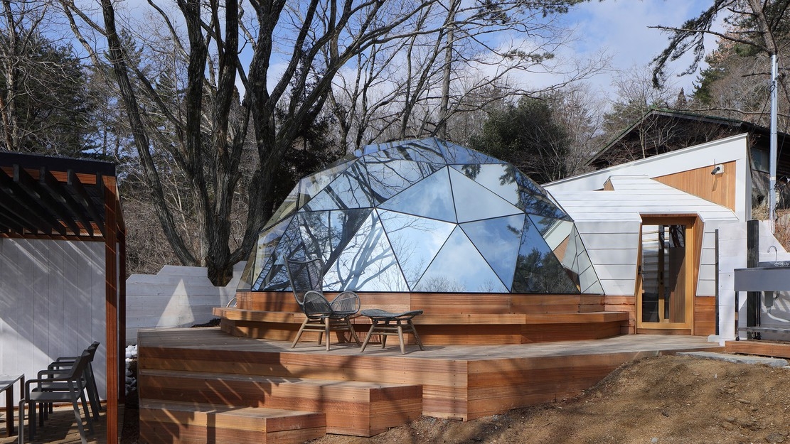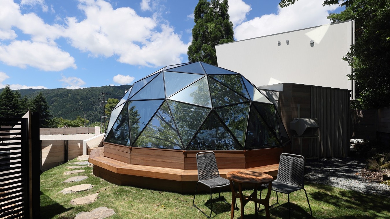 直径6.5メートル全面ガラス張りのドーム棟と、アウトドアリビング・シャワー・トイレを設置したユーティリティ棟から成り立つ建物となっております。