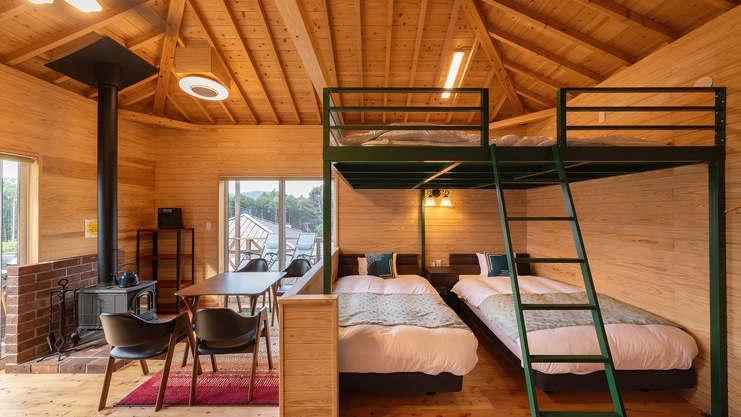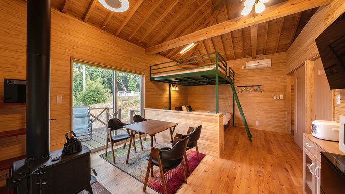 露天風呂付■洋室35平米+ロフト寝室+ウッドデッキ21平米■セミダブル×2台+布団2組■源泉かけながし檜風呂■ミニキッチン、キッチン用品、スマートTV完備