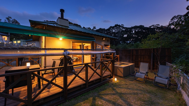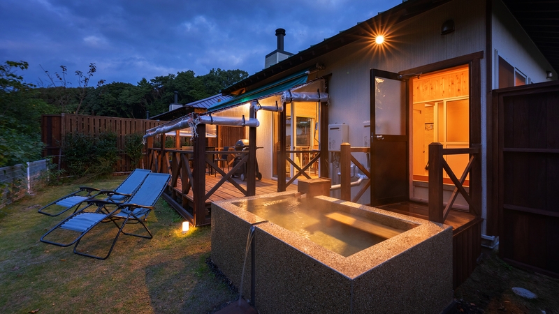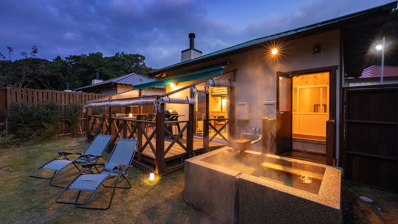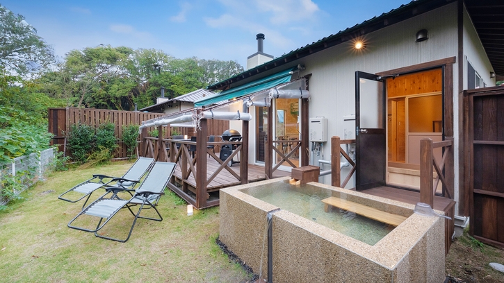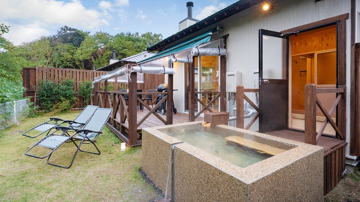 露天風呂+ガーデン付■洋室35平米+ロフト寝室+ウッドデッキ21平米+お庭■セミダブル×2台+布団2組■源泉かけながし檜風呂■ミニキッチン、キッチン用品完備